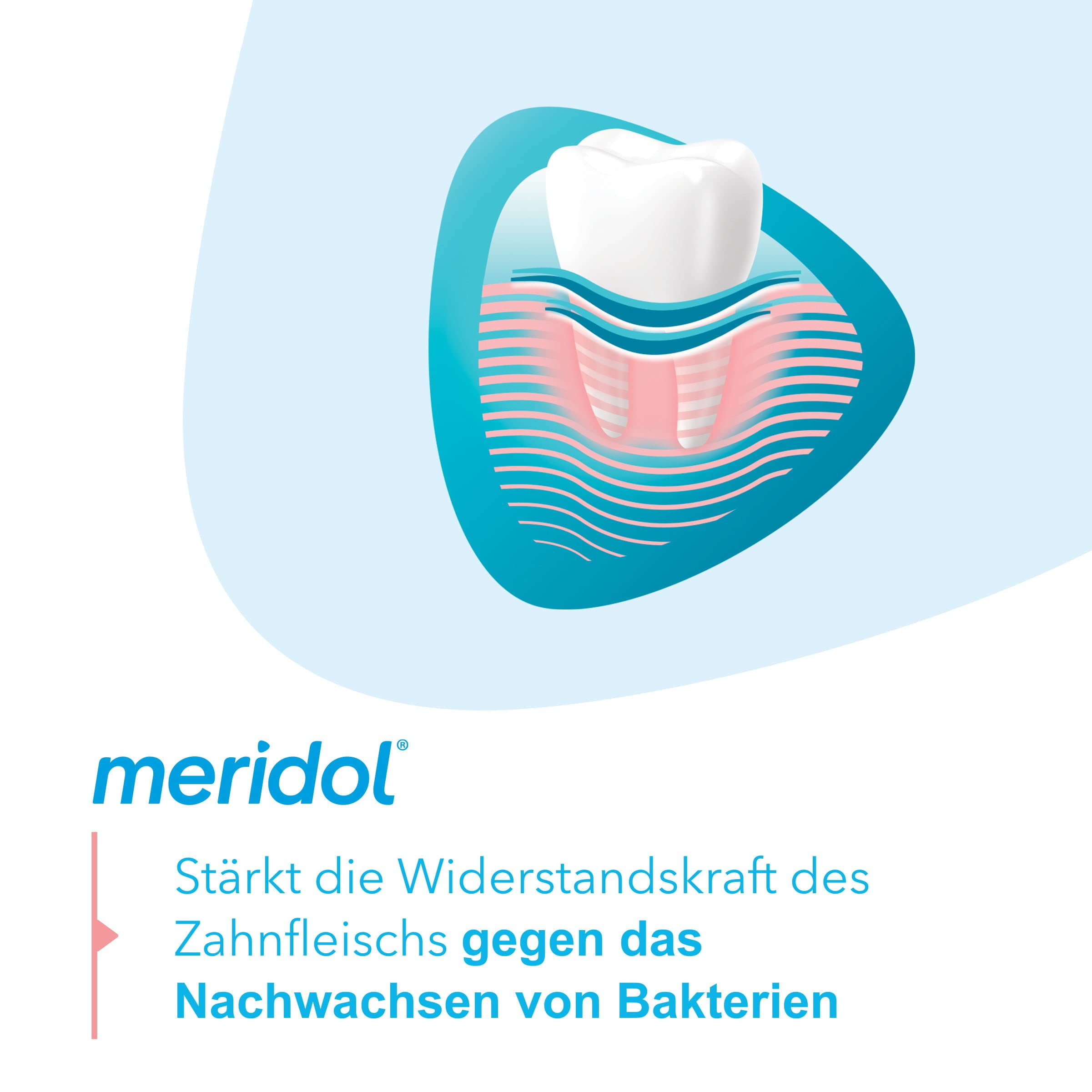 - ROUTINE: To round off your care routine particularly effectively and to optimally protect your oral cavity from gingivitis, plaque and tartar, we recommend that you combine the meridol toothpaste with the meridol mouthwash and the meridol fluffy dental floss.