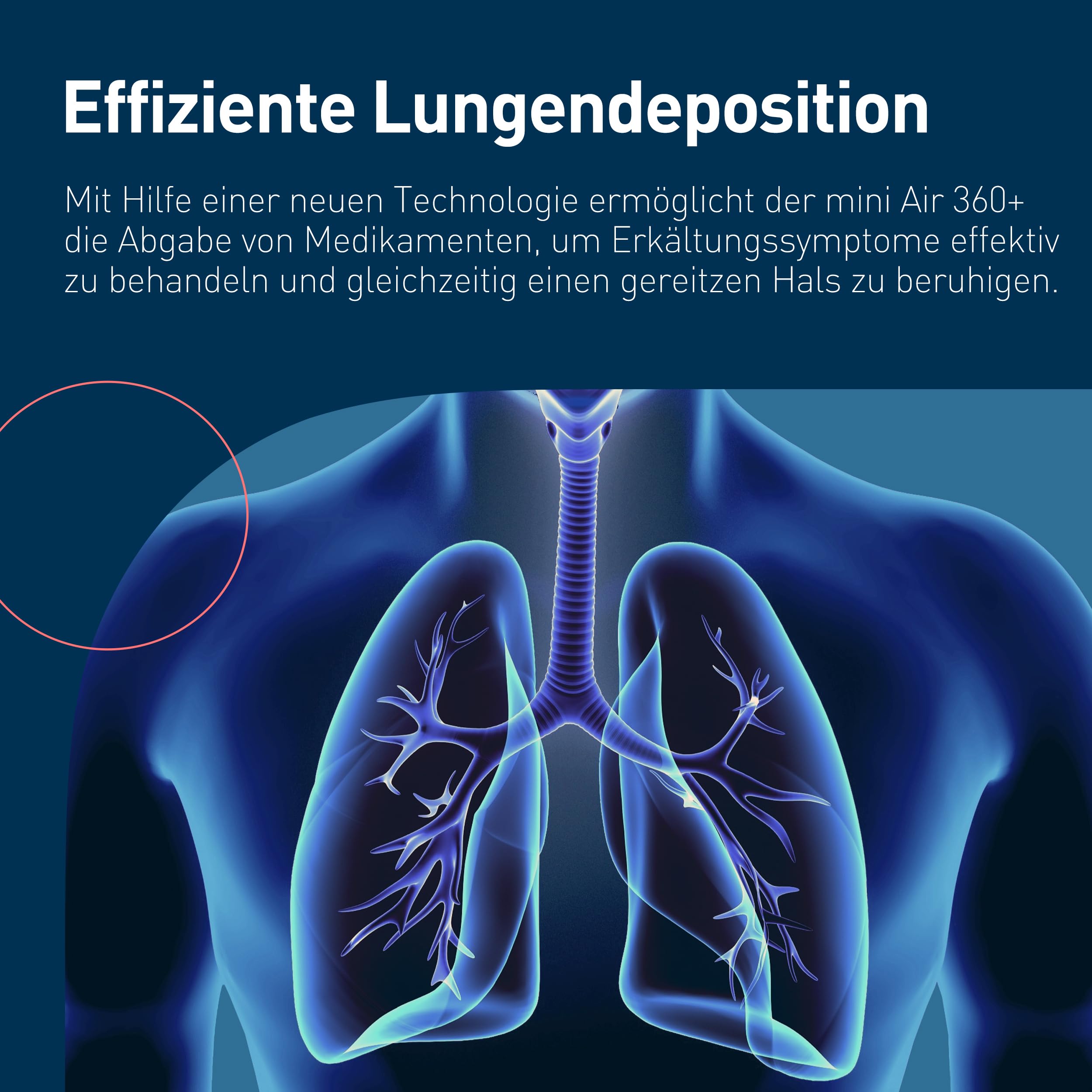 - EFFECTIVE TREATMENT OF YOUR RESPIRATORY TRACT. The lightweight, pocket-sized mini Air 360+ inhaler clears your airways whenever and wherever you want. The efficient delivery of medication to the lungs helps treat symptoms and soothe an irritated throat.