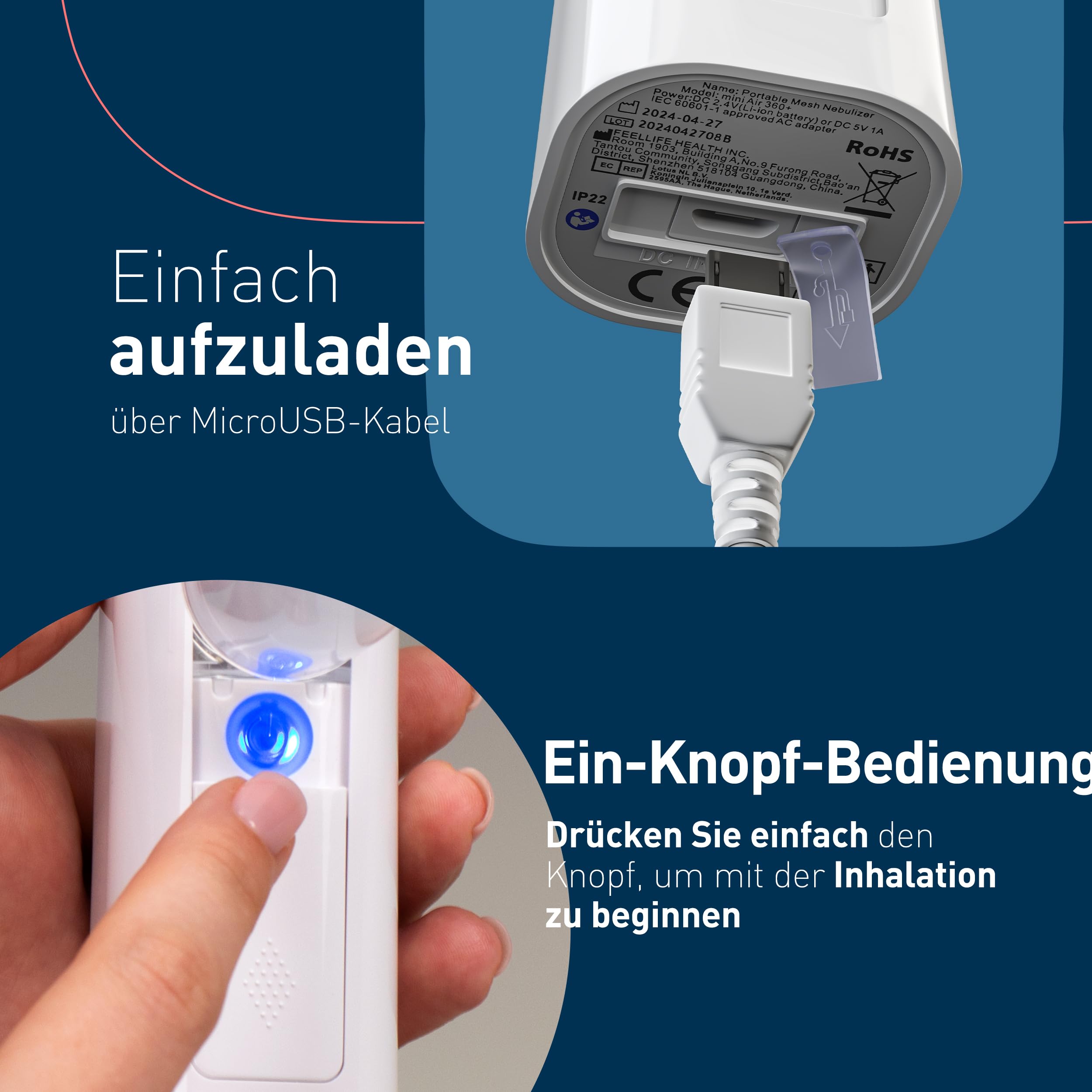 - CHARGING VIA MICRO-USB. Charge the mini Air 360+ nebulizer on the go via micro-USB (cable included).