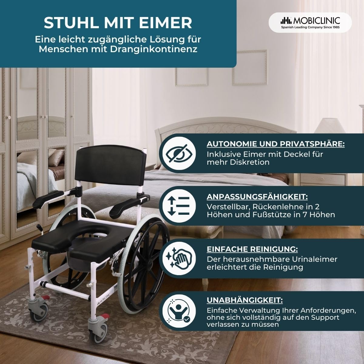- 🚽FUNCTIONAL AND PRACTICAL DESIGN: The Caligula commode chair is designed to facilitate access to the toilet and personal hygiene directly from the chair, improving the user's comfort and quality of life. It features a padded seat, armrests, and folding footrests that facilitate access and ensure comfort. It is also height-adjustable, allowing you to configure it between 96 and 101 cm to suit your needs.