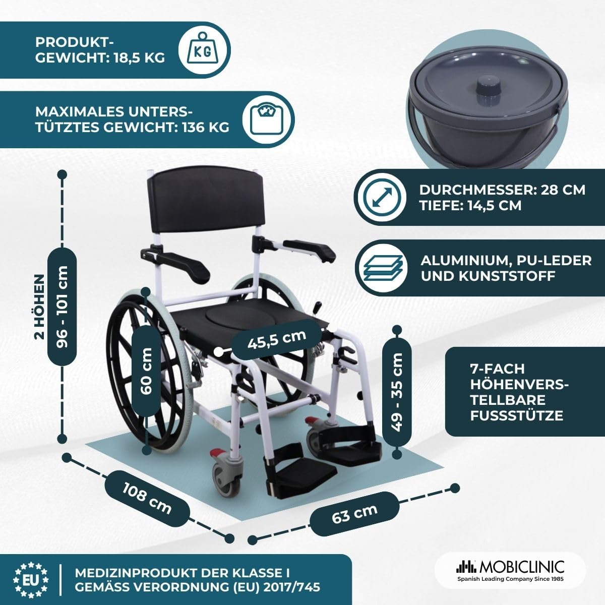 - 🧳 VERSATILE AND PRACTICAL: This shower wheelchair with wheels is designed to provide comfort and ease of use in any space. Thanks to its sturdy structure, it fits perfectly on toilets up to 46 cm high and 45 cm wide, making it versatile and practical for use both at home and in other environments. Our chair has an overall width of 63 cm, allowing it to fit through standard 72 cm wide doorways.