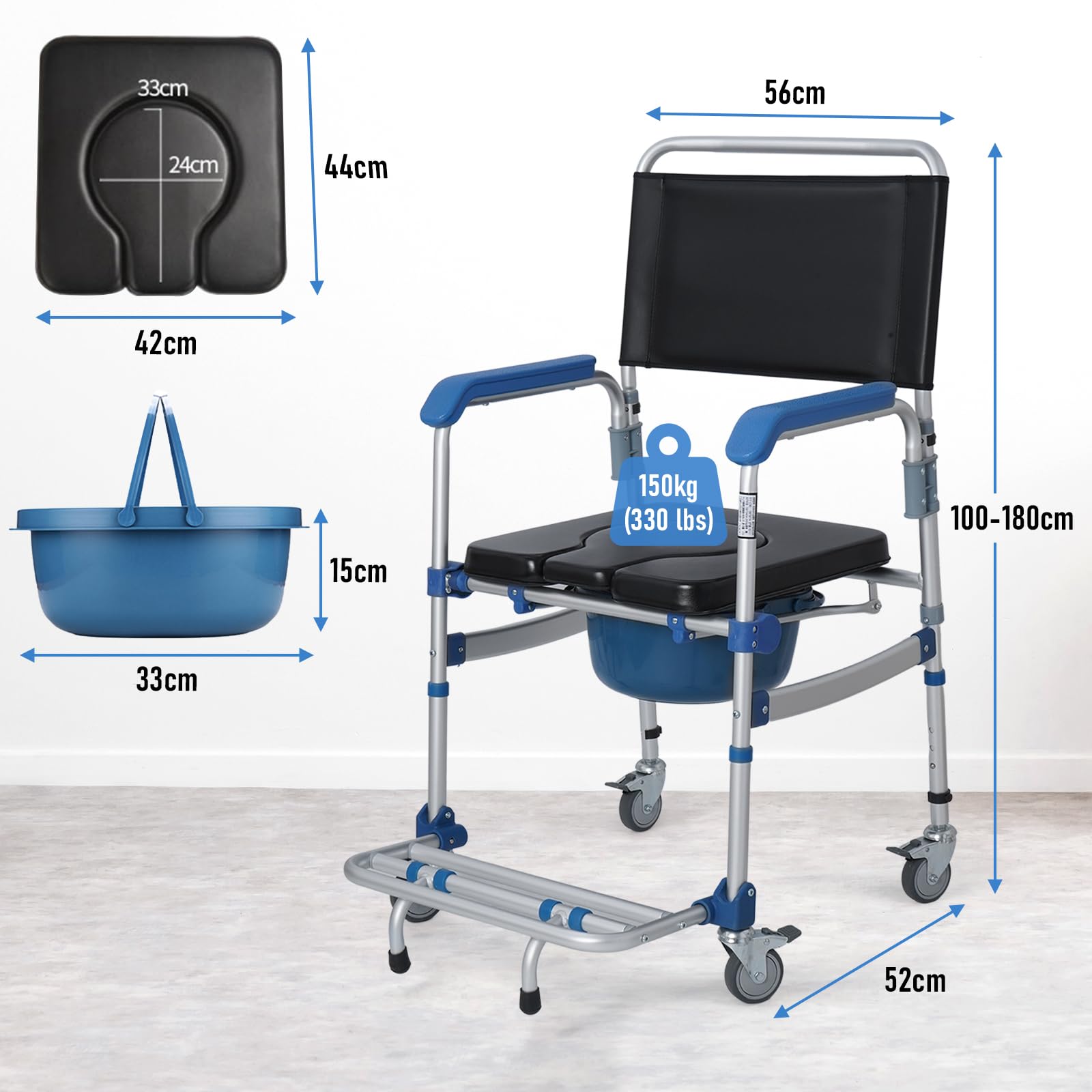 - Comfortable: The shower wheelchair's backrest and seat are made of high-quality waterproof leather, with internal sponge cushions. The height and angle of the seat and pedal are ergonomically designed. The middle part of the seat plate is removable, and the hole in the middle measures 33*24cm in diameter after removal. It can be used as a regular wheelchair or commode chair.