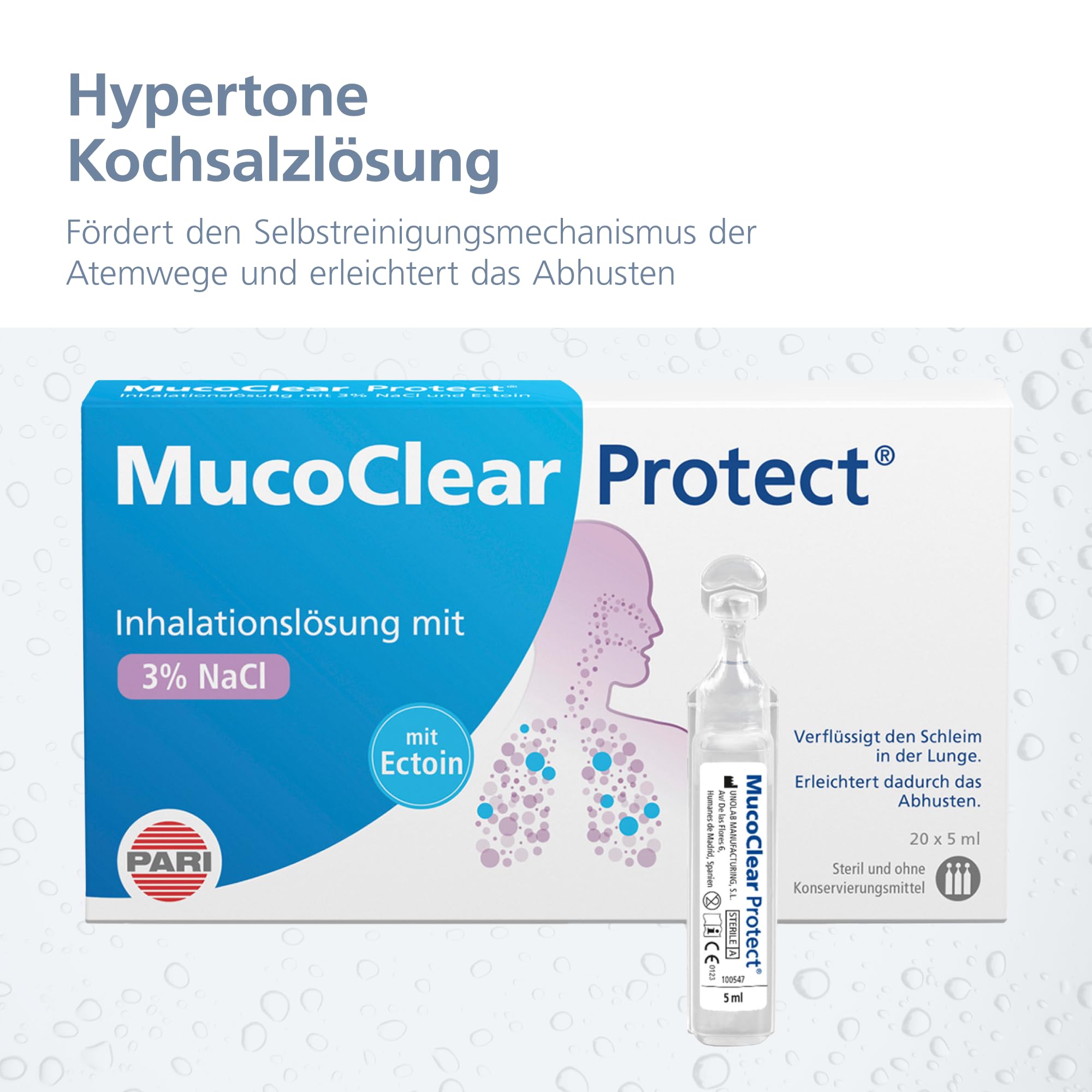 - FOR YOUR INHALATION DEVICE – Depending on your needs, a sterile ampoule containing 5 ml of inhalation solution can be inhaled to mobilize secretions. For this purpose, we recommend a modern inhalation device from PARI.