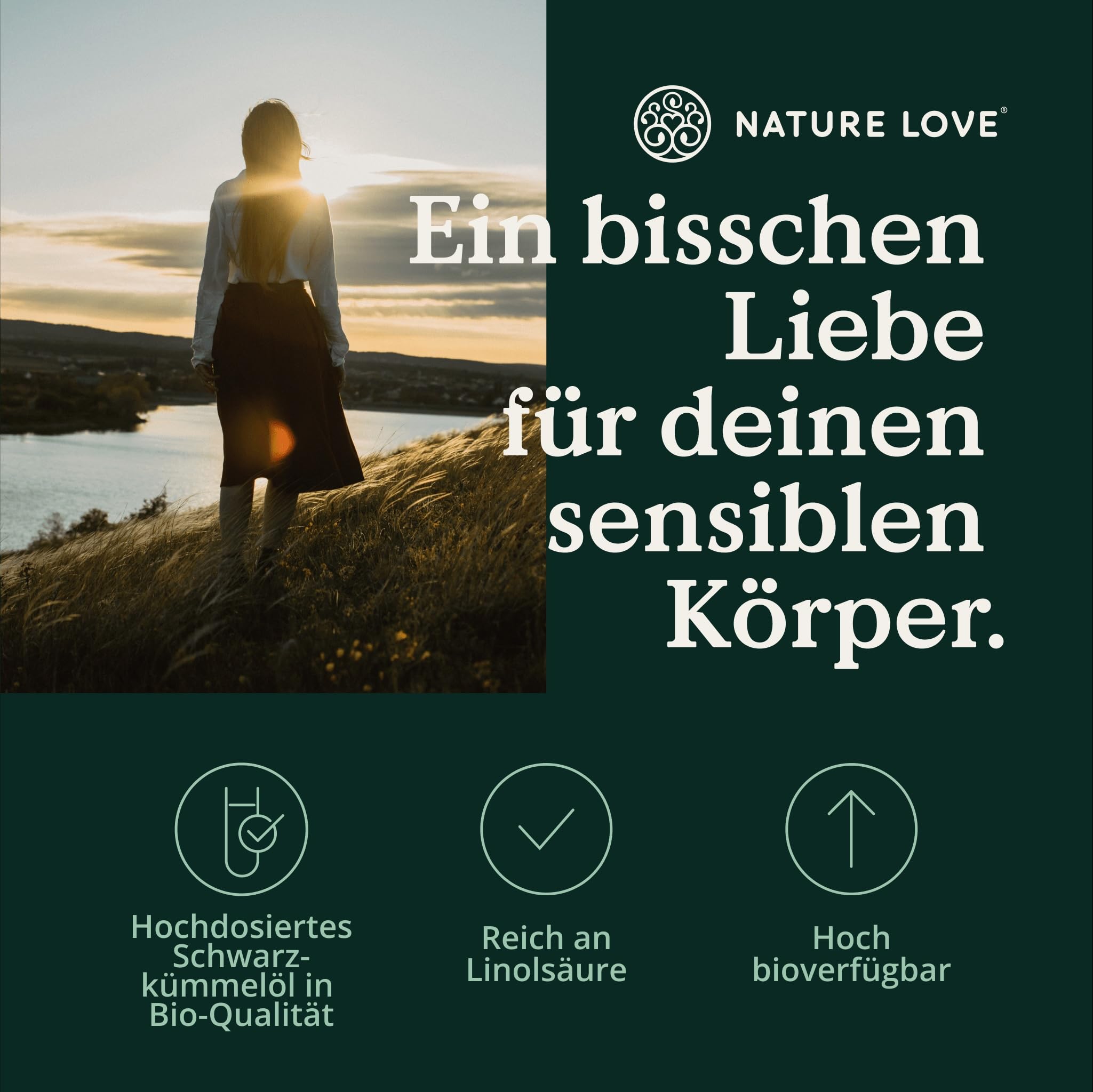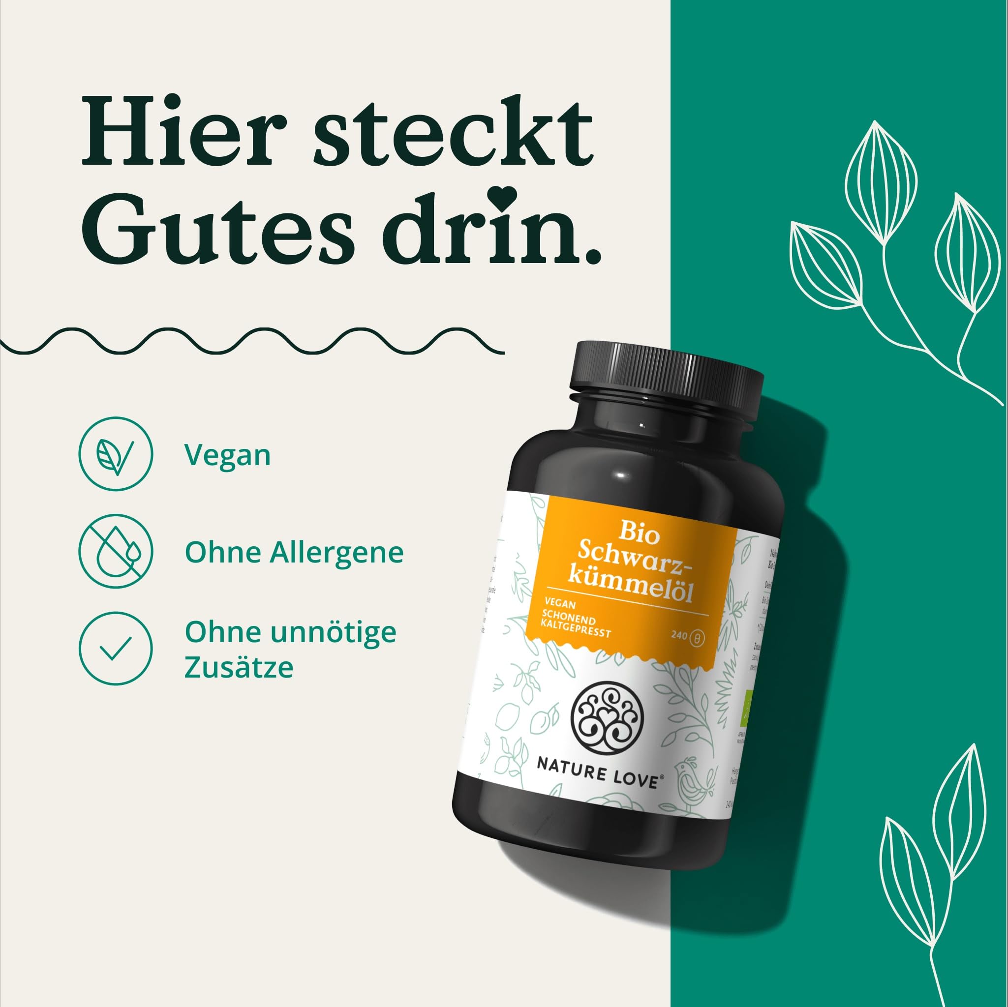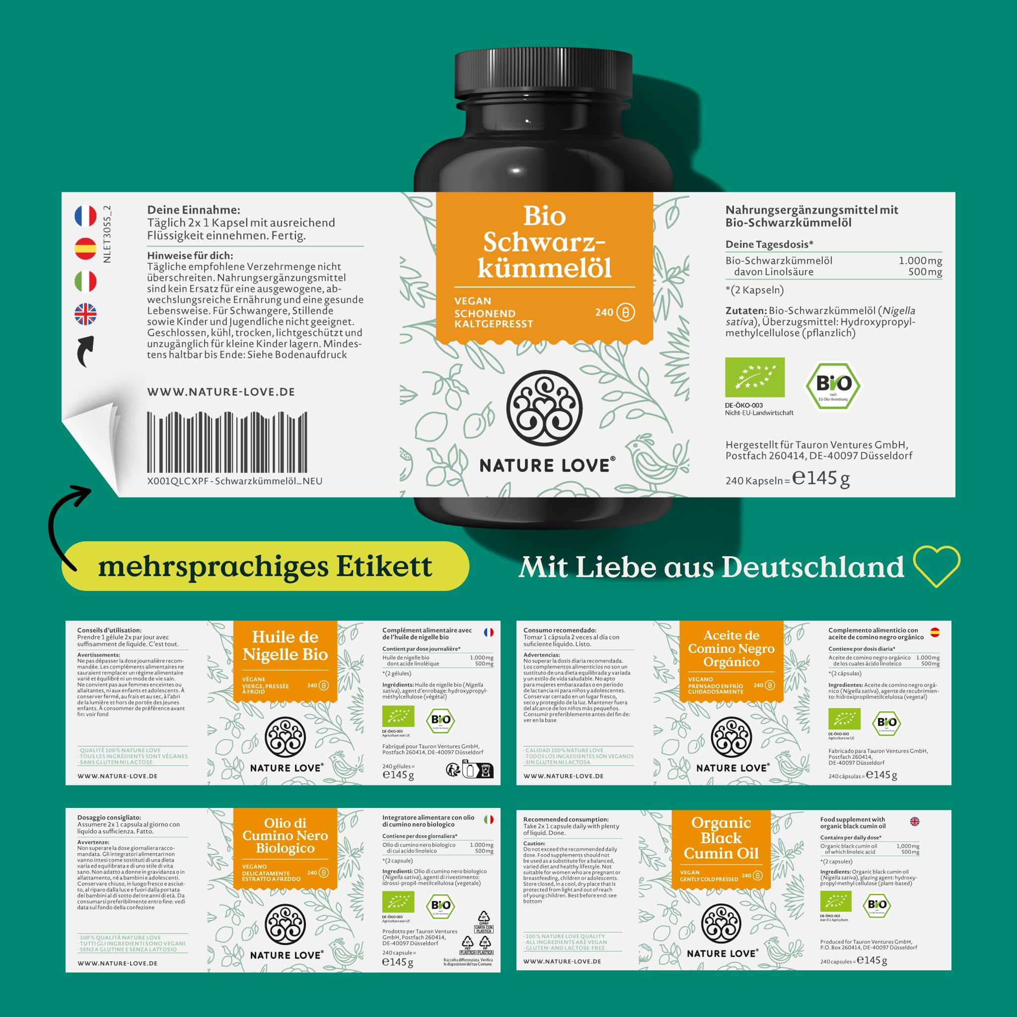 NATURE LOVE® Organic Black Cumin Oil - 240 vegan capsules - high dosage: 1000mg Egyptian per daily dose - of which 50% linoleic acid - cold-pressed, naturally produced and laboratory-tested
