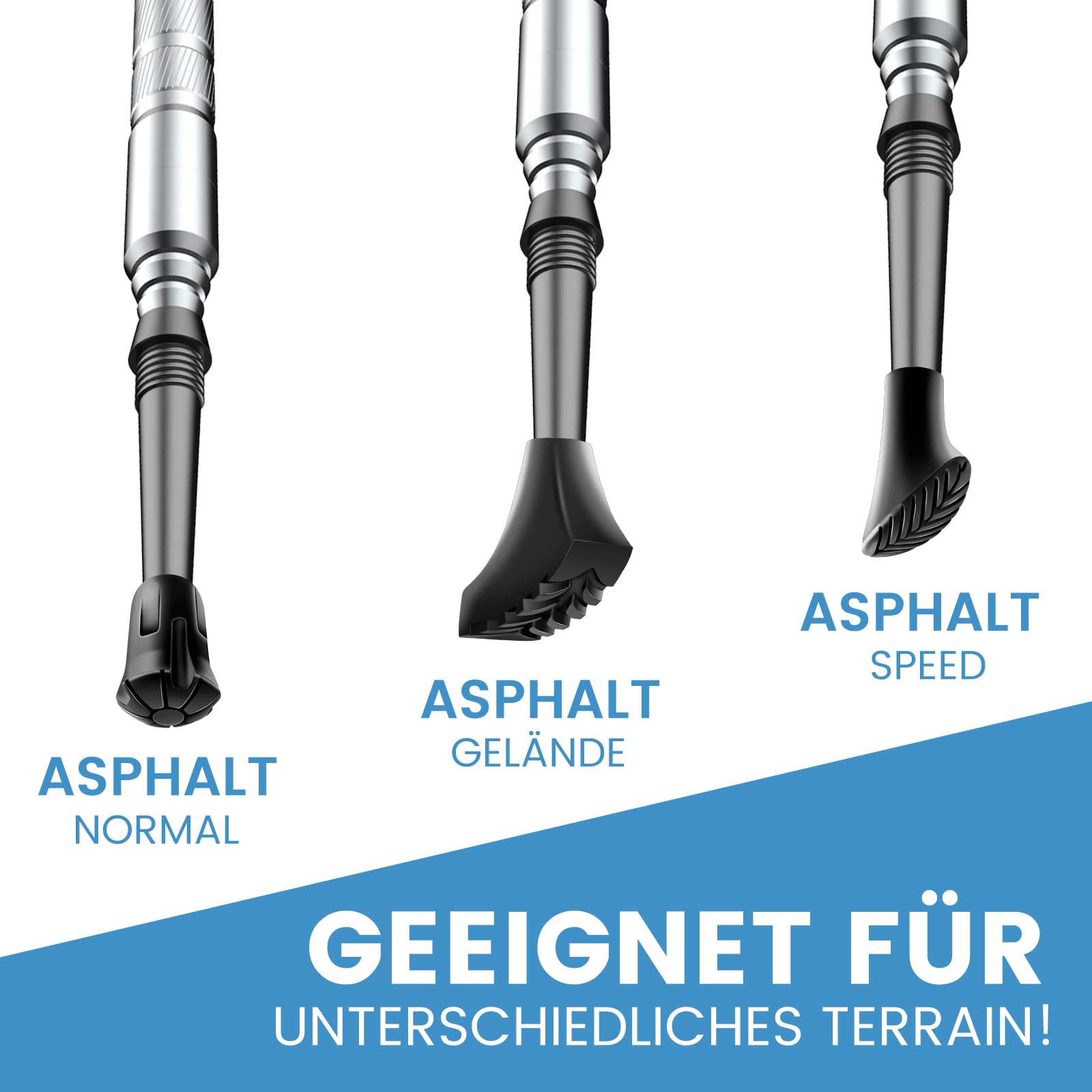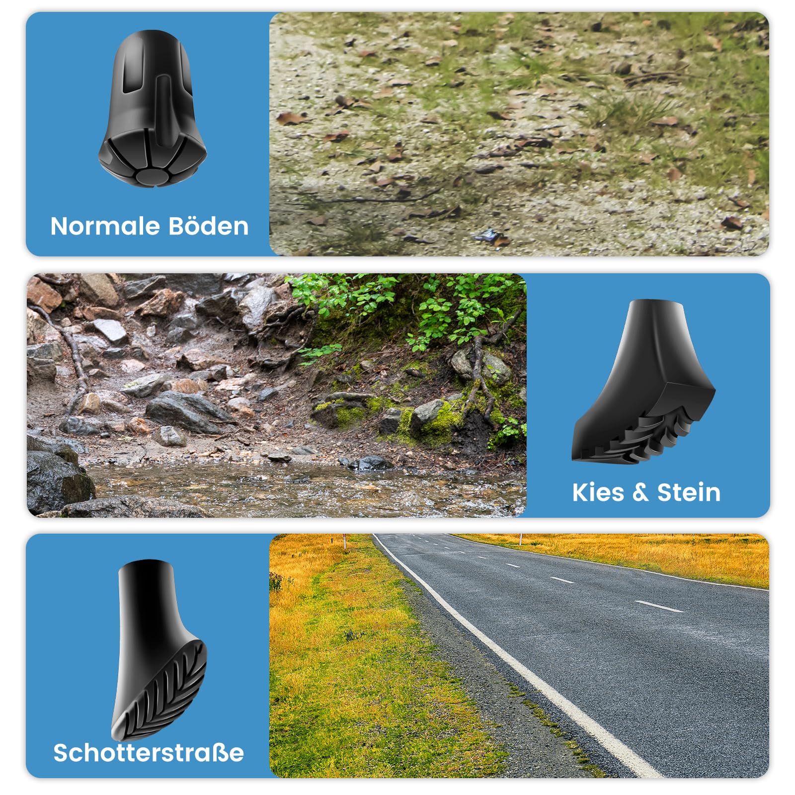 - Safety and stability: With three different designs, the Nordic walking poles' rubber bumpers are suitable for a variety of surfaces. The large boot bumpers have a deep tread, allowing them to perform better in inclement weather. The large shoe bumpers are suitable for asphalt and can absorb noise. The round rubber bumpers are suitable for any terrain and offer good grip.