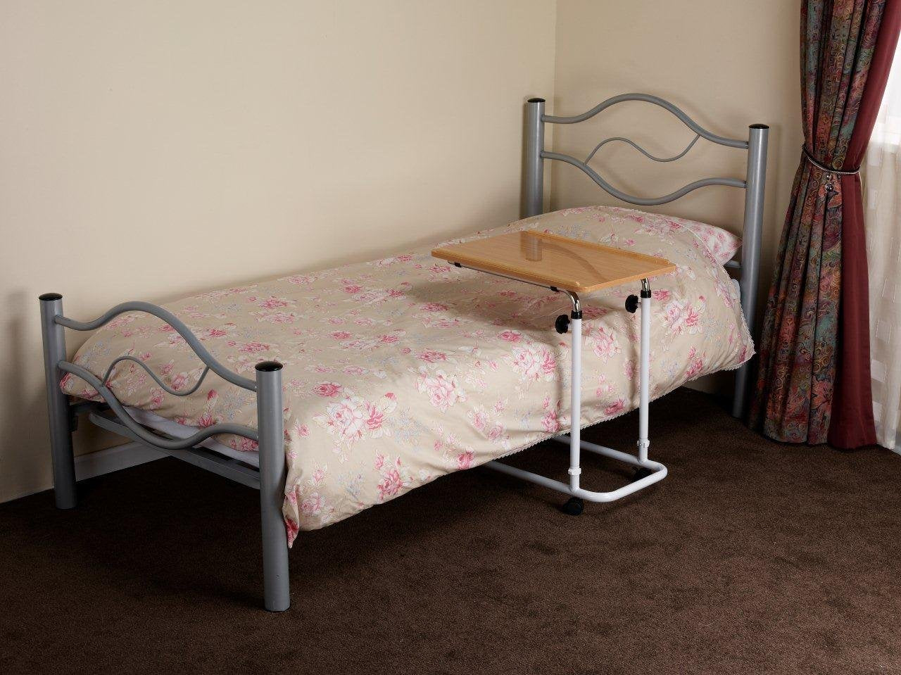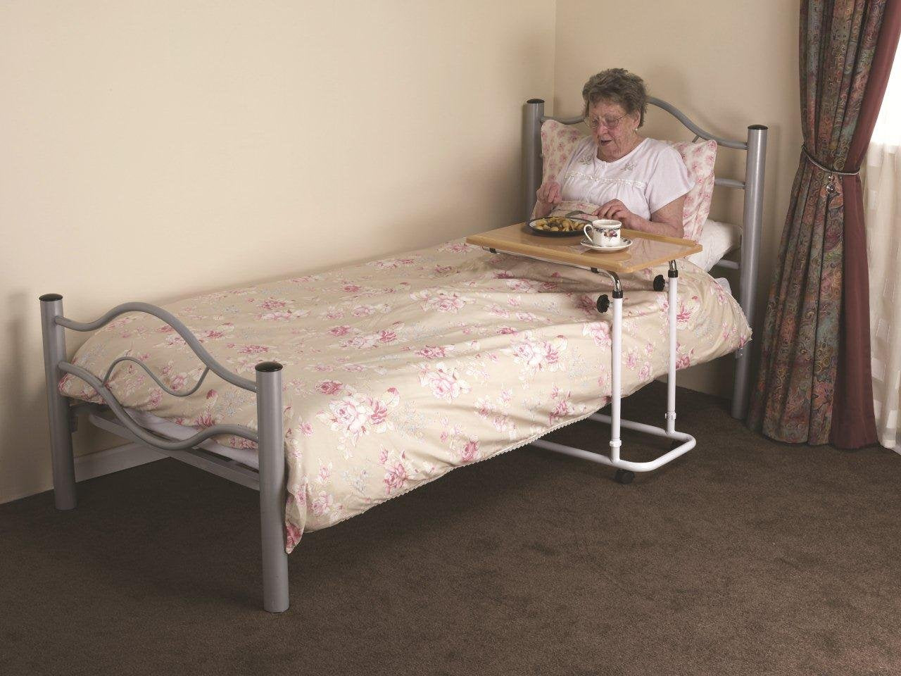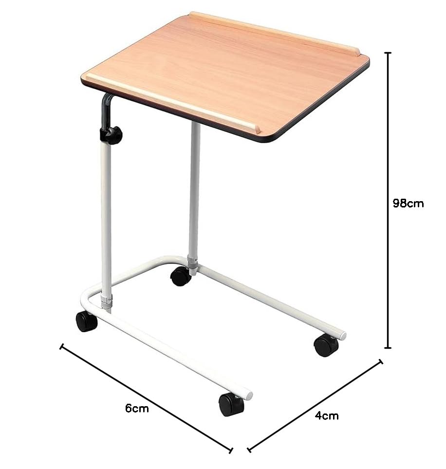 - Table with wheels for use while sitting in a bed or chair
