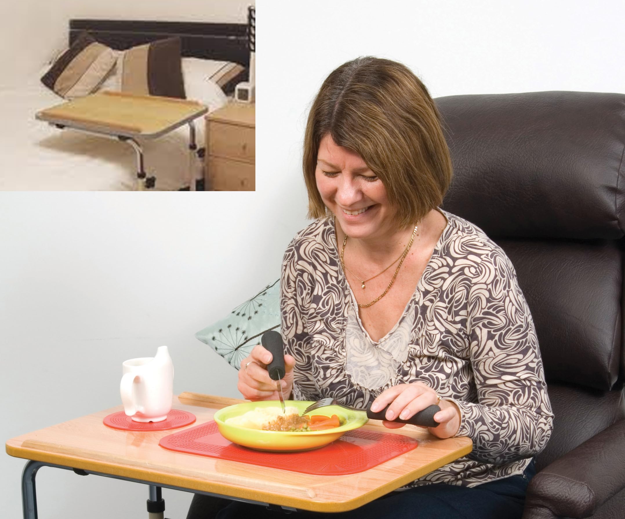 This attractive chair with casters from Nottingham Rehab Supplies is ideal for use around the home, especially in the bedroom or living room. It allows the user to sit comfortably in bed or a chair with a convenient table nearby. It is suitable for use by children, adults, and wheelchair users.