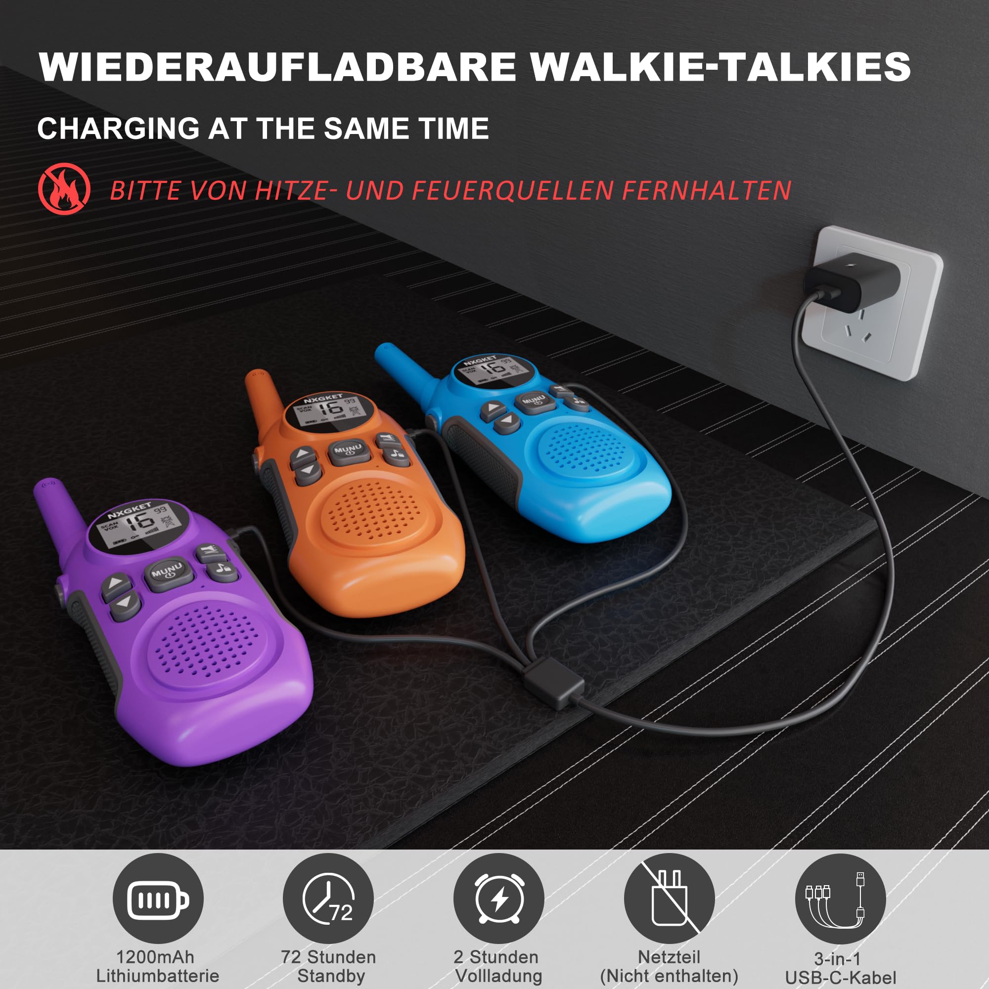 - 【RECHARGEABLE LI-ION BATTERIES】Our rechargeable walkie talkies come with built-in 1200mAh lithium-polymer batteries and a USB Type-C charging cable, allowing you to charge up to three radios simultaneously. The walkie talkies can be used for 1 day on a full charge and up to 3 days in standby mode. Compared with AA alkaline batteries, the non-removable rechargeable lithium-ion battery is safer, more economical, and has a longer lifespan, allowing you to recharge it anytime, anywhere.