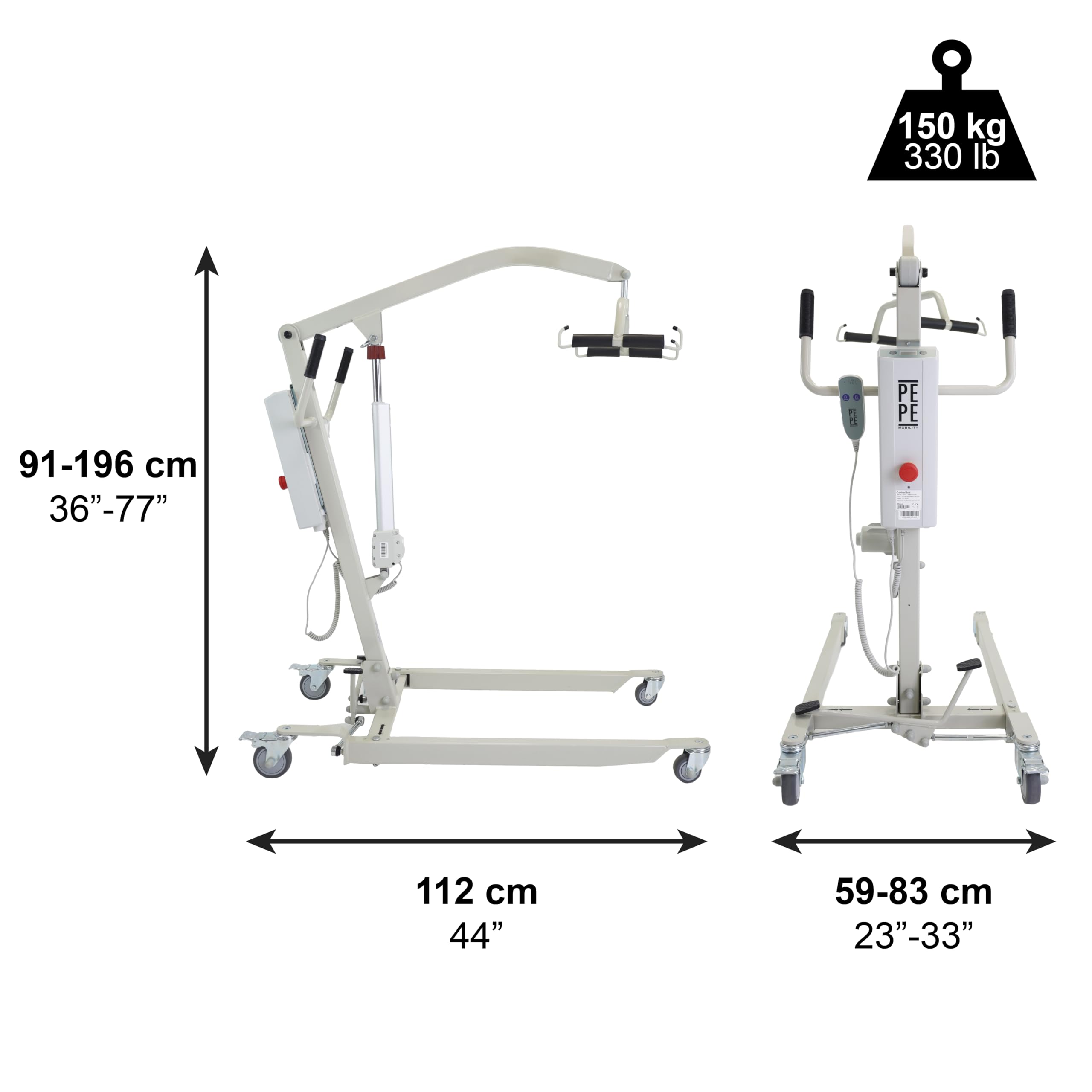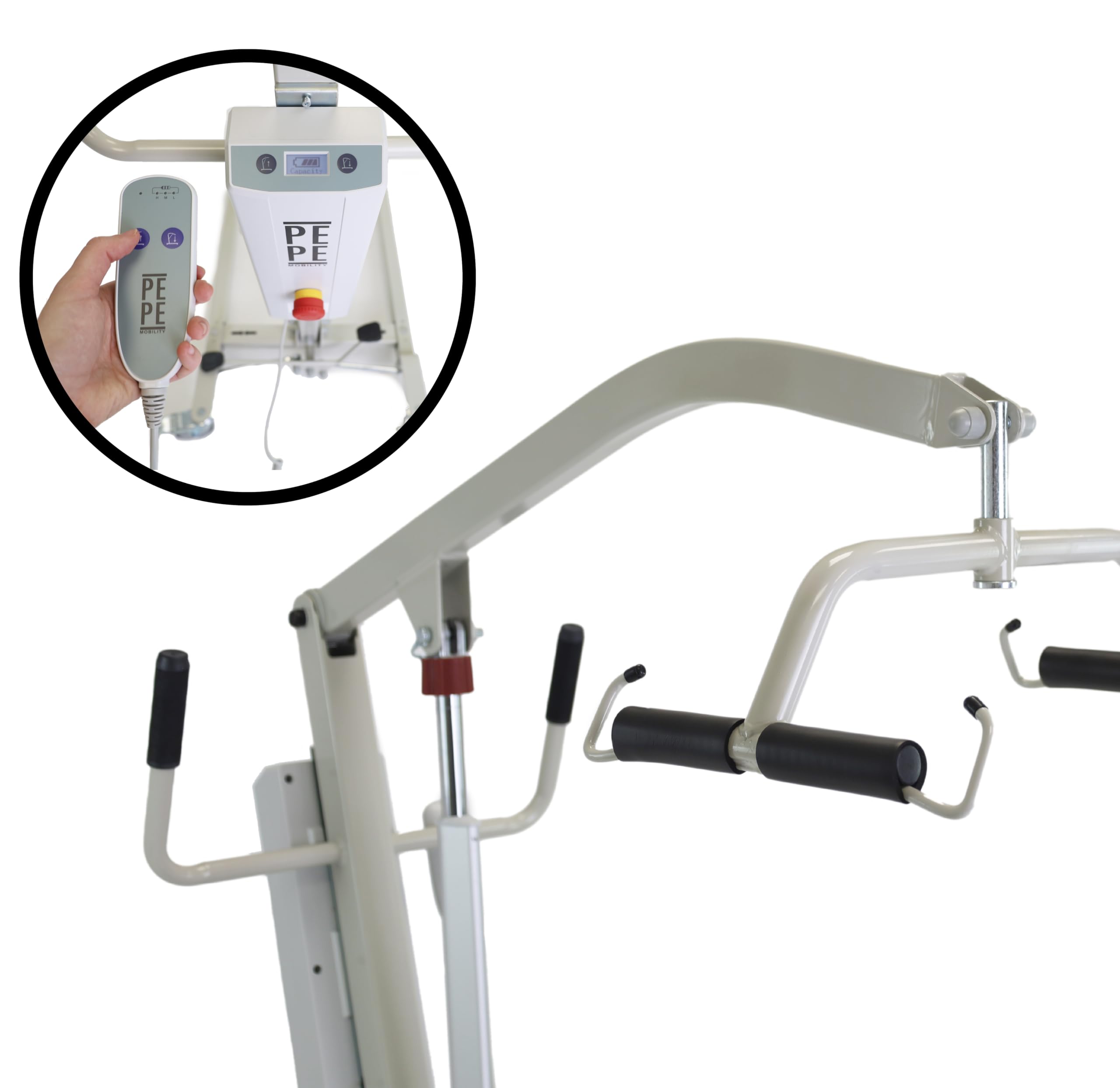 - EASY TO USE: To use the transfer chair, place it in front of the user and engage the wheel brakes. The user should then place their feet on the base platform and their arms on the padded bars to gain momentum for standing. The legs rest on the knee pads. Once standing, lower the seating platforms so the user is stable for the transfer. Finally, pull the pulley on the seats and position the patient in the desired position.