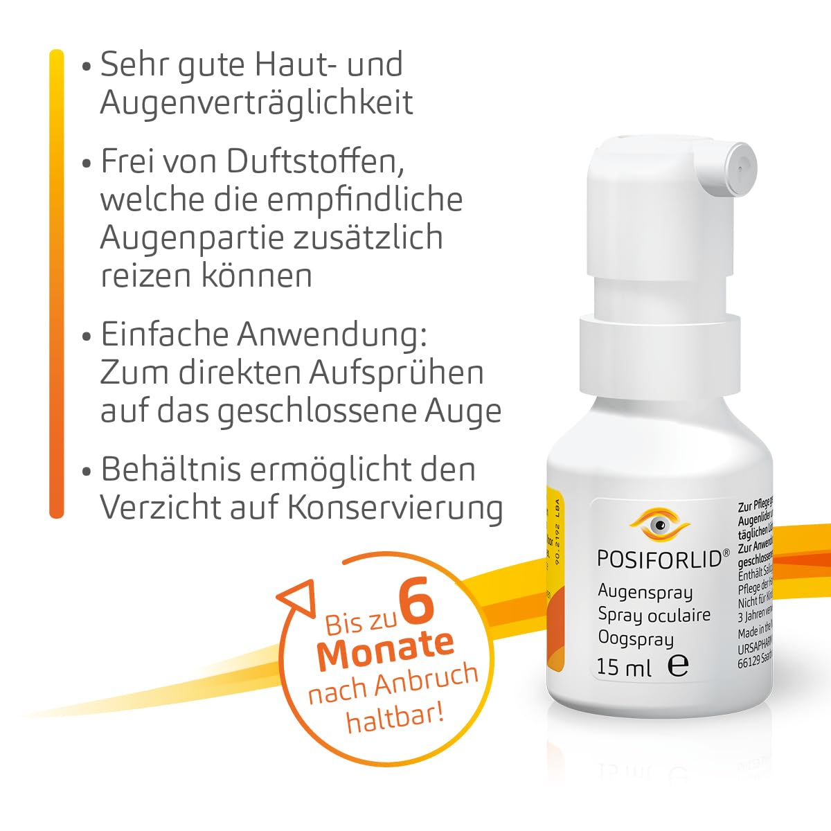 POSIFORLID Eye Spray was specially developed for the soothing care of irritated eyelids and as supportive care for blepharitis. It can also be used as part of daily eyelid hygiene to prevent recurrence of irritation. The special trio of Euphrasia, salicylic acid, and hyaluronic acid moisturizes, soothes, and cares for the sensitive eyelid skin, leaving it hydrated and supple again. The unique formula is free of preservatives and fragrances and is very well tolerated by the eyelid skin.* Thanks to its practical spray bottle, daily eyelid care becomes a quick routine: Simply spray onto closed eyes and enjoy the cared-for feeling. Wiping is not necessary. With approximately 250 pumps, the eye spray is very economical and can be used for up to six months after opening. The eye spray is also suitable for removing deposits on the eyelids or between the eyelashes. To do this, spray the eye spray onto a cotton pad. Suitable for use by children aged 3 years and over. Eyelid margin hygiene should be as much a part of your daily routine as brushing your teeth if you have blepharitis or meibomian gland dysfunction. If done carefully and regularly, cleaning and caring for the eyelid margins helps maintain the functionality of the eyelid margin glands (meibomian glands) and thus prevent eyelid inflammation. Eyelid margin hygiene with POSIFORLID products: In addition to using the POSIFORLID eye spray, the additional use of POSIFORLID eyelid hygiene wipes and the self-heating POSIFORLID eye mask may be beneficial. When combining these products, use the POSIFORLID eyelid hygiene wipes after heat treatment with the POSIFORLID eye mask to clean the eyelids and eyelid margins. The POSIFORLID eye spray completes eyelid margin hygiene by caring for and soothing the eyelids. * URSAPHARM data on file, 05/2017