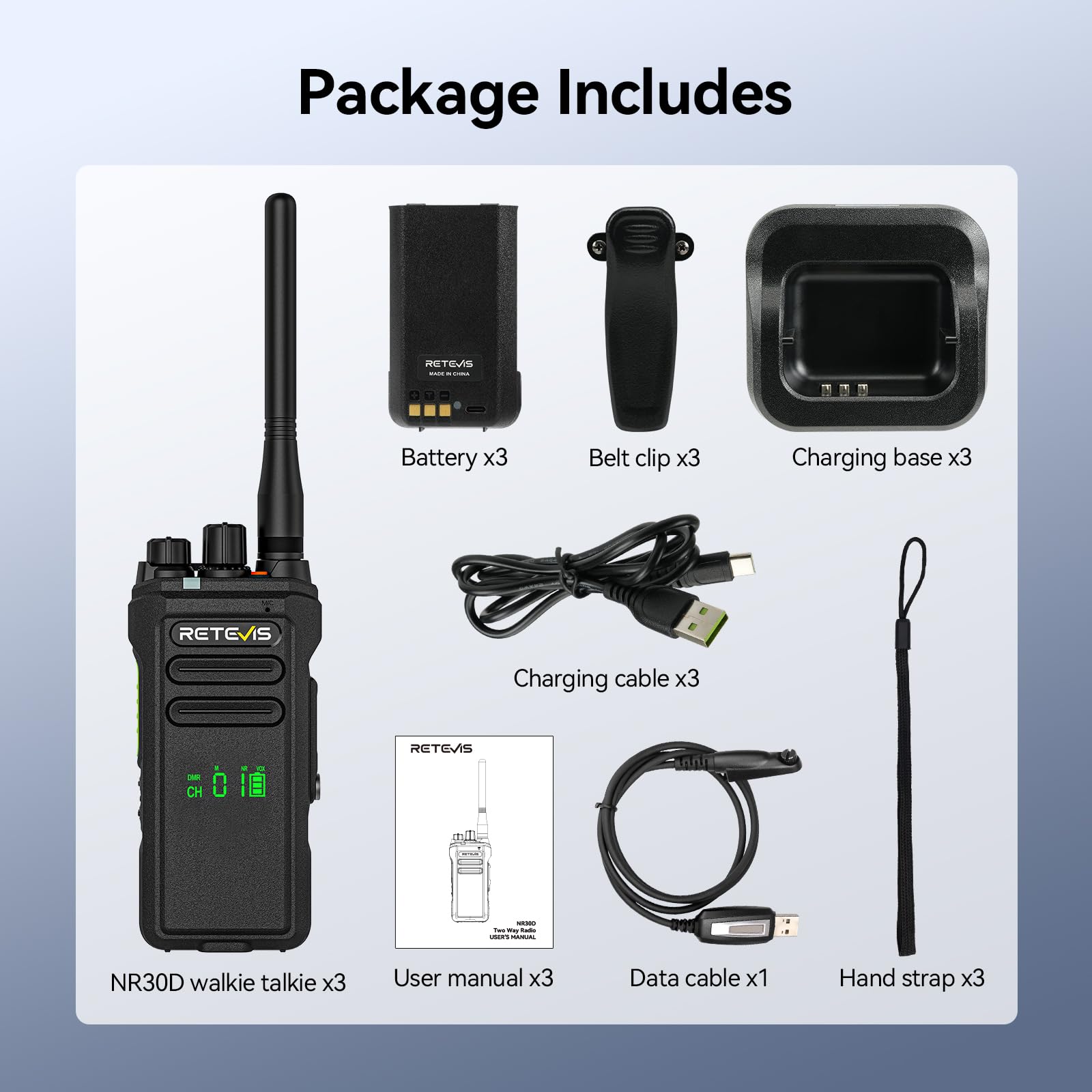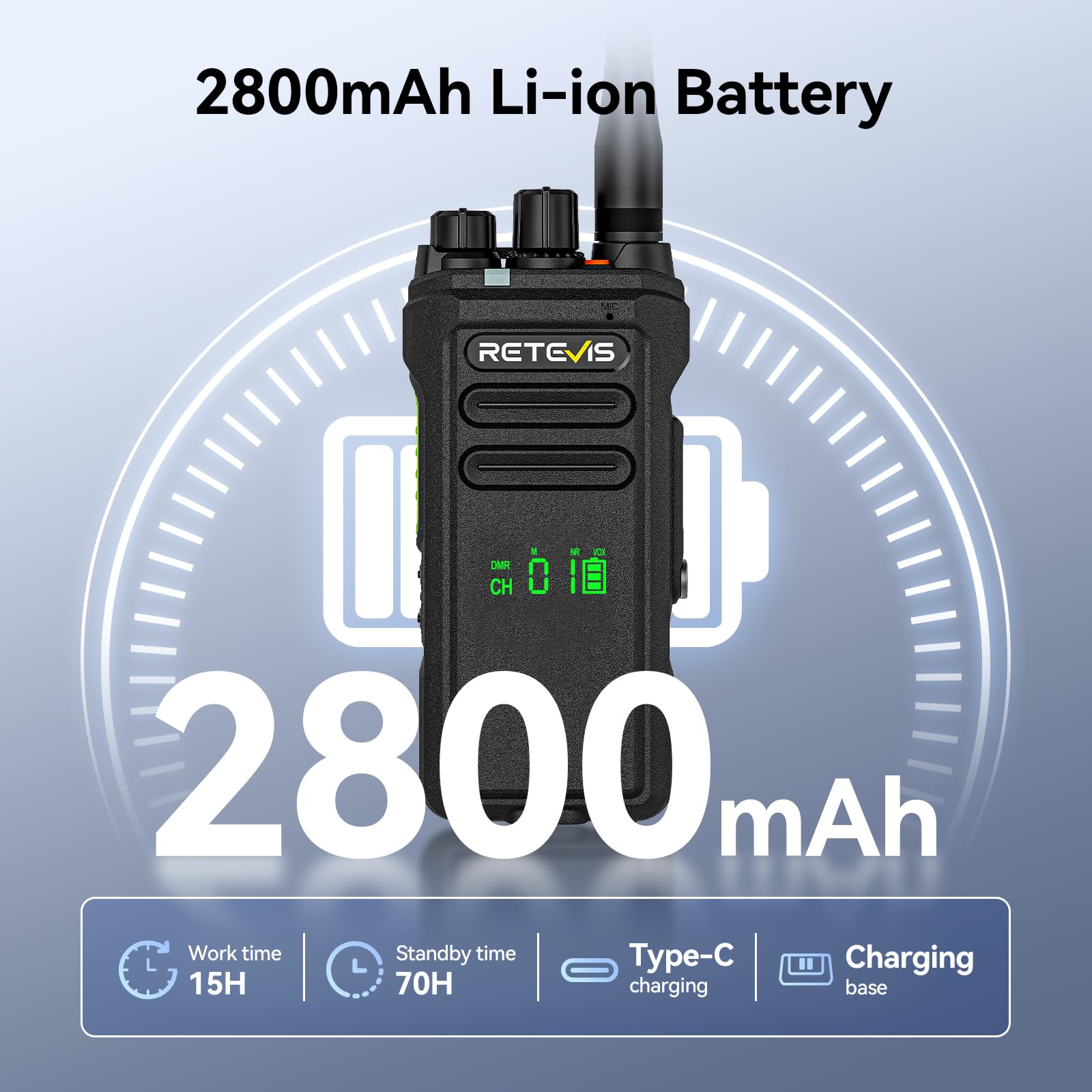 - Rechargeable walkie talkie for adults; 2800mAh battery capacity allows you to use for 15 hours without frequent charging; Type-C charging and desktop charging conveniently charge the NR30D; you won't worry about running out of power when working for a whole day