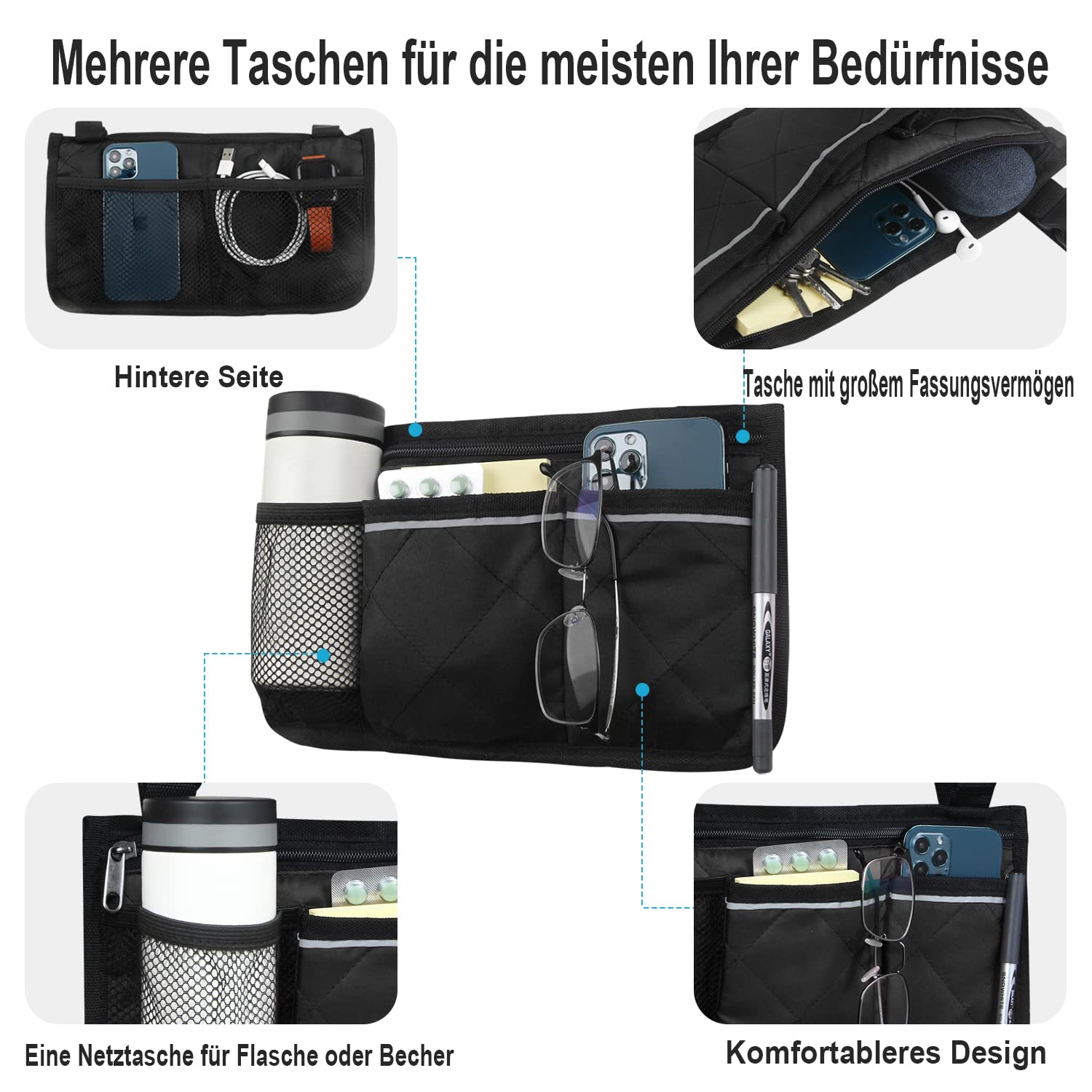 - ✔ Durable for long-lasting use: This armrest bag is made of high-quality fabric. You can easily attach and remove the storage bag with the durable, adjustable straps for long-lasting use.