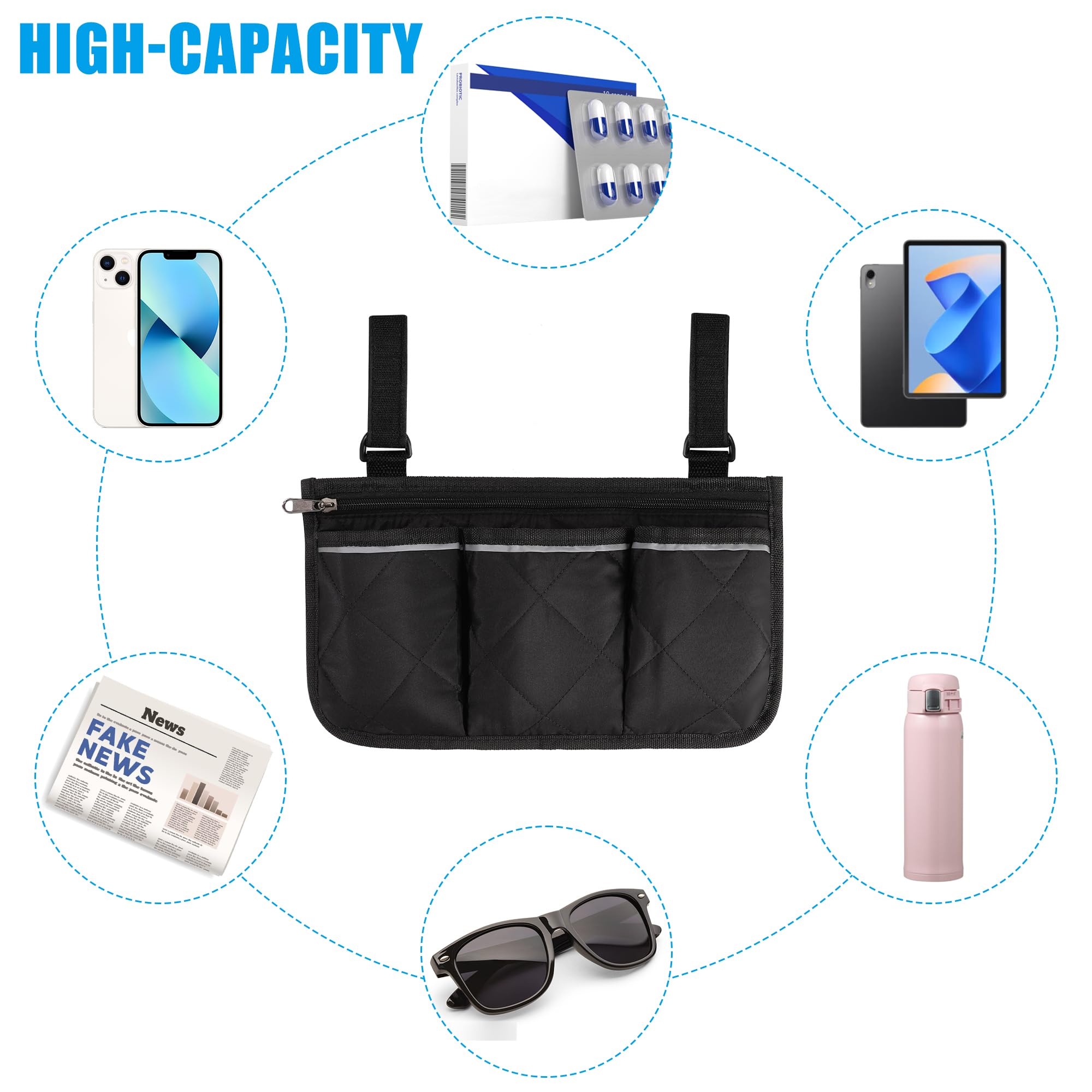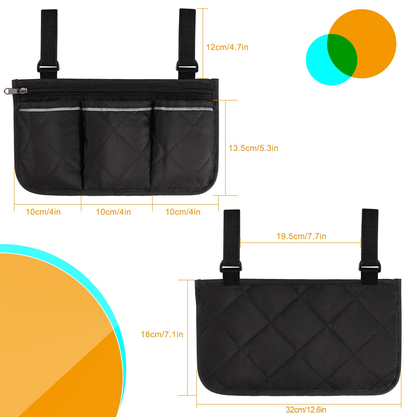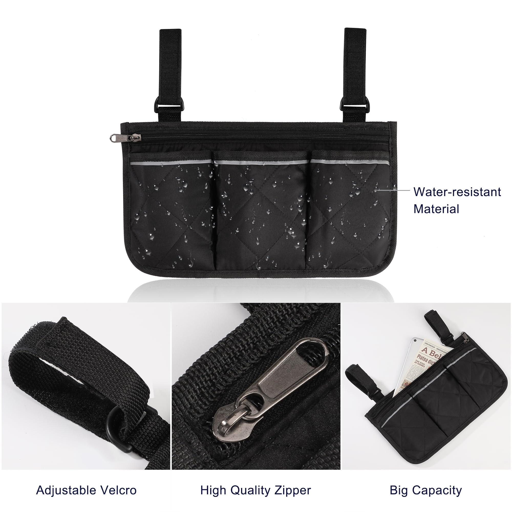 - Multifunctional Wheelchair Bag: The entire wheelchair bag measures 8.9 x 7.1 inches and features a large zippered compartment and three open pockets. It can store your cell phones, pens, newspapers, reading glasses, keys, water bottles, medications, etc., making your life so much easier.