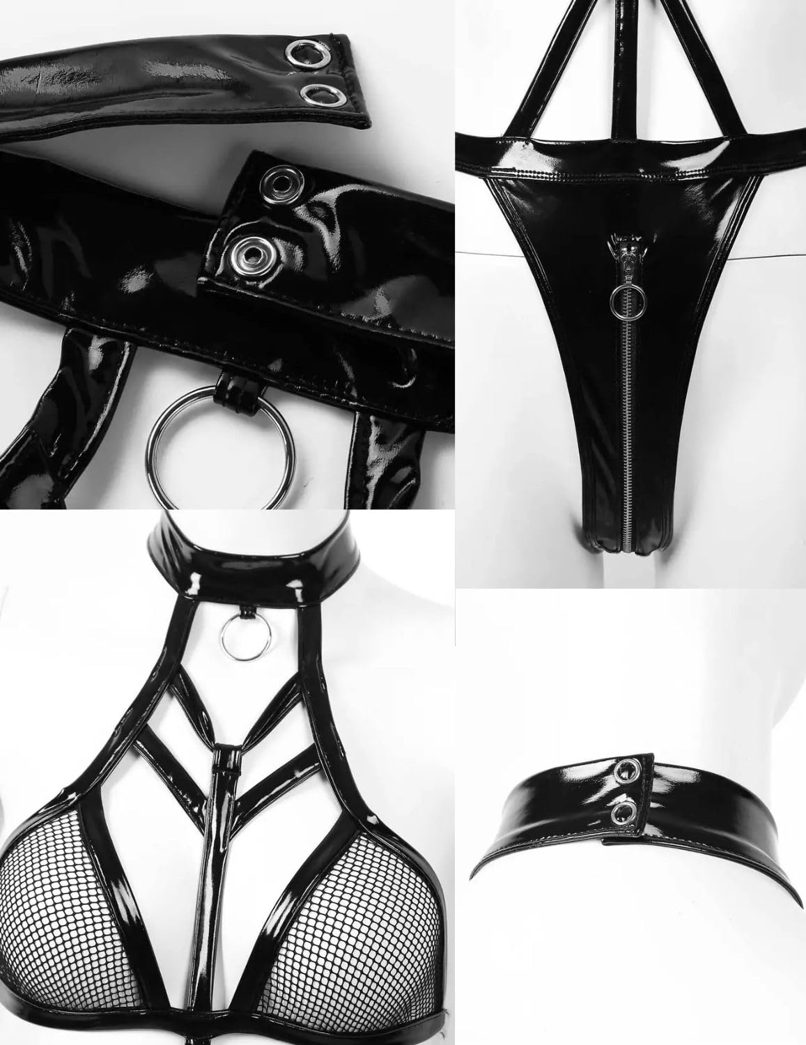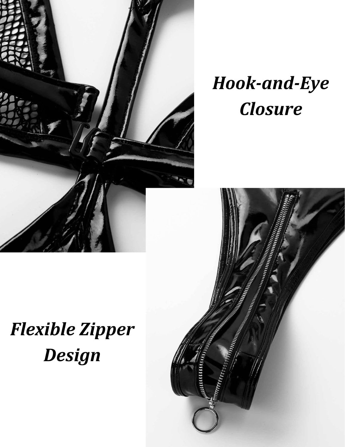 - SEXY DESIGN: A one-piece leather bodysuit for women that shows off your charming curves, featuring a unique patchwork design of patent leather with mesh, a sexy halter neck and a zippered thong, and a hollow design that perfectly shows your charm.
