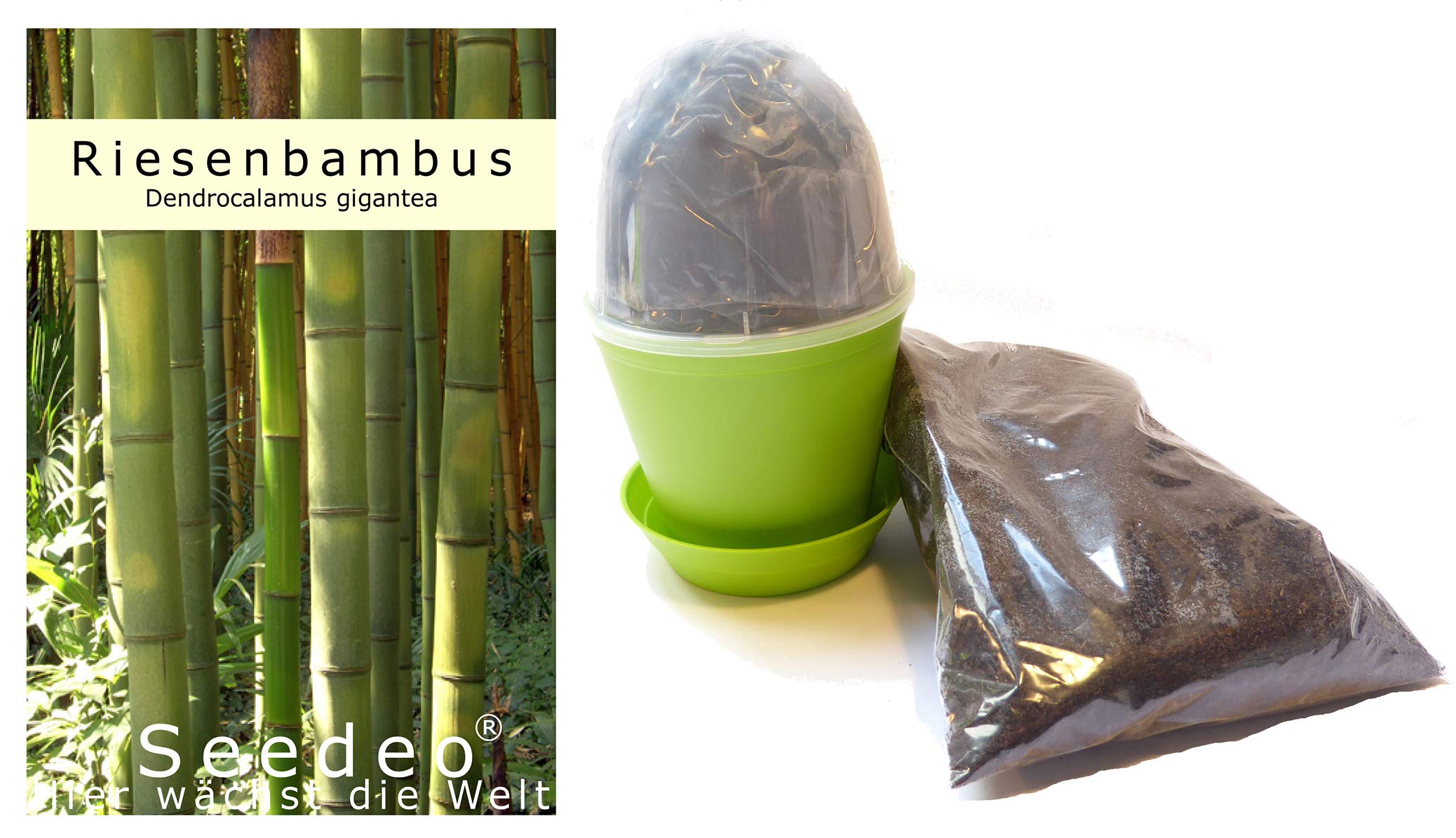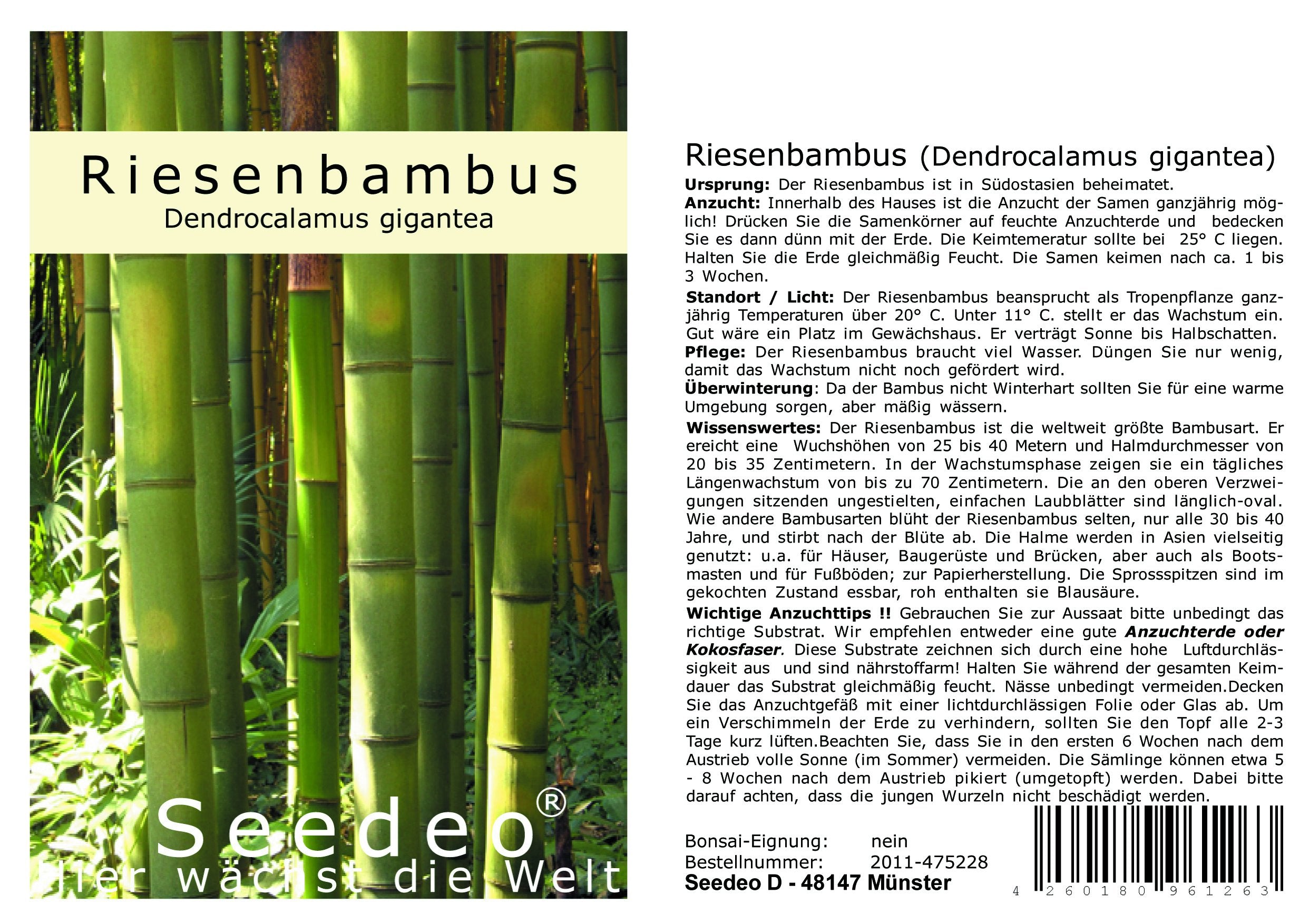 Details: Giant bamboo (Dendrocalamus gigantea) Origin: The giant bamboo is native to Southeast Asia. Propagation: Seeds can be grown indoors year-round! Press the seeds onto moist potting soil and then cover them thinly with soil. The germination temperature should be 25°C. Keep the soil evenly moist. The seeds germinate after about 1 to 3 weeks. Location/Light: As a tropical plant, the giant bamboo requires year-round temperatures above 20°C. It stops growing below 11°C. A greenhouse would be ideal. It tolerates sun to partial shade. Care: The giant bamboo needs plenty of water. Fertilize only sparingly to prevent further growth. Wintering: Since the bamboo is not winter hardy, you should provide a warm environment but water moderately. Interesting facts: The giant bamboo is the world's largest bamboo species. It reaches heights of 25 to 40 meters and stem diameters of 20 to 35 centimeters. During the growth phase, they exhibit a daily growth rate of up to 70 centimeters. The stalkless, simple leaves on the upper branches are oblong-oval. Like other bamboo species, the giant bamboo rarely blooms, only every 30 to 40 years, and dies after flowering. The stems have a wide range of uses in Asia, including for houses, scaffolding, and bridges.
