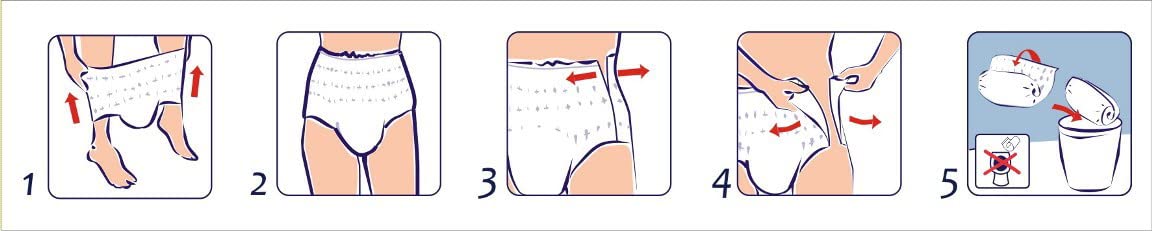 Put on like regular underwear. Change if wet or soiled and dispose of immediately. Wear correctly and choose the appropriate size during physical activity.