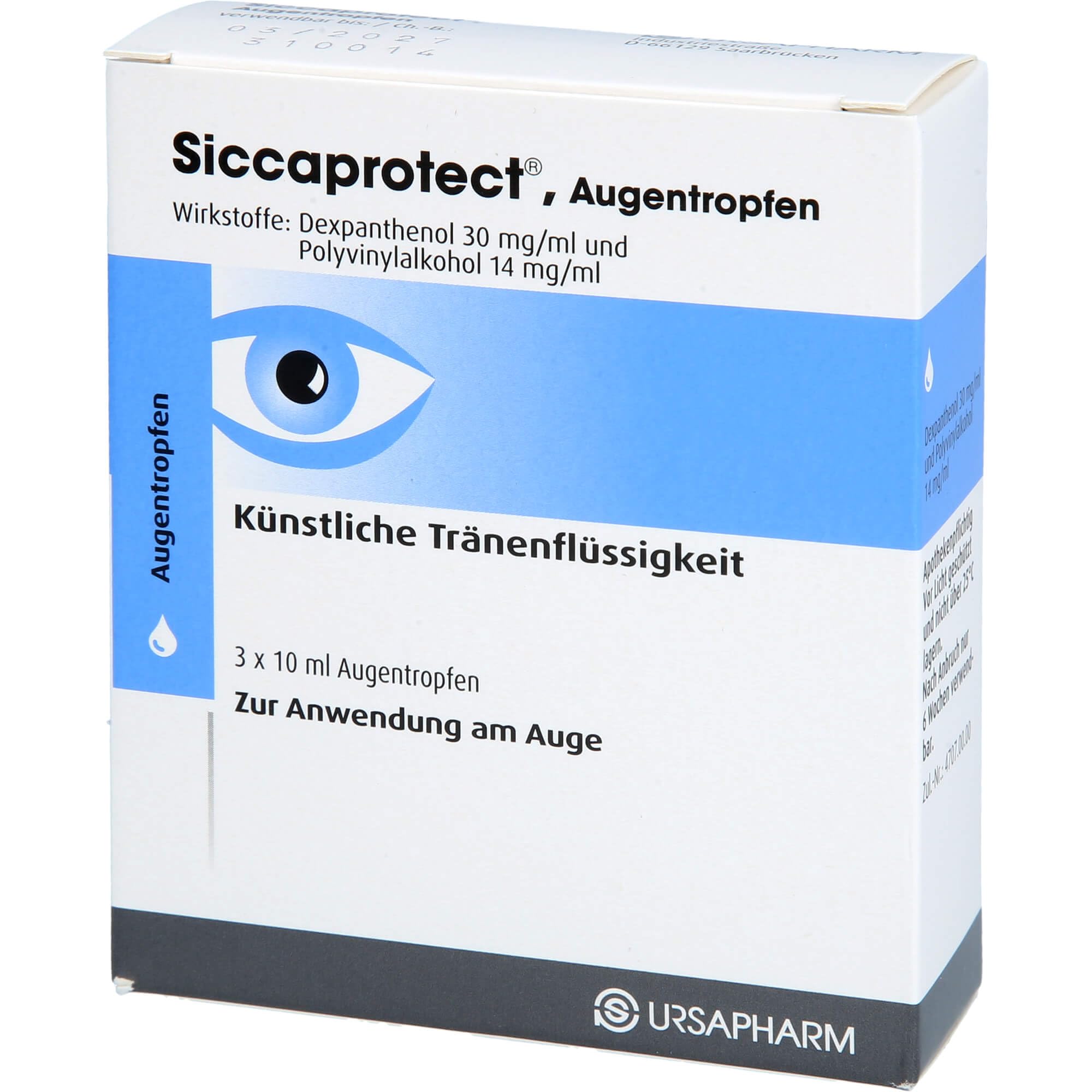 Ingredients: Active ingredients: Dexpanthenol and polyvinyl alcohol.; For the symptomatic treatment of drying symptoms of the cornea and conjunctiva as a result of tear secretion disorders due to local or systemic (entire body-affecting) underlying diseases, as well as in cases of insufficient eyelid closure and for hard contact lenses. For rewetting during the day.