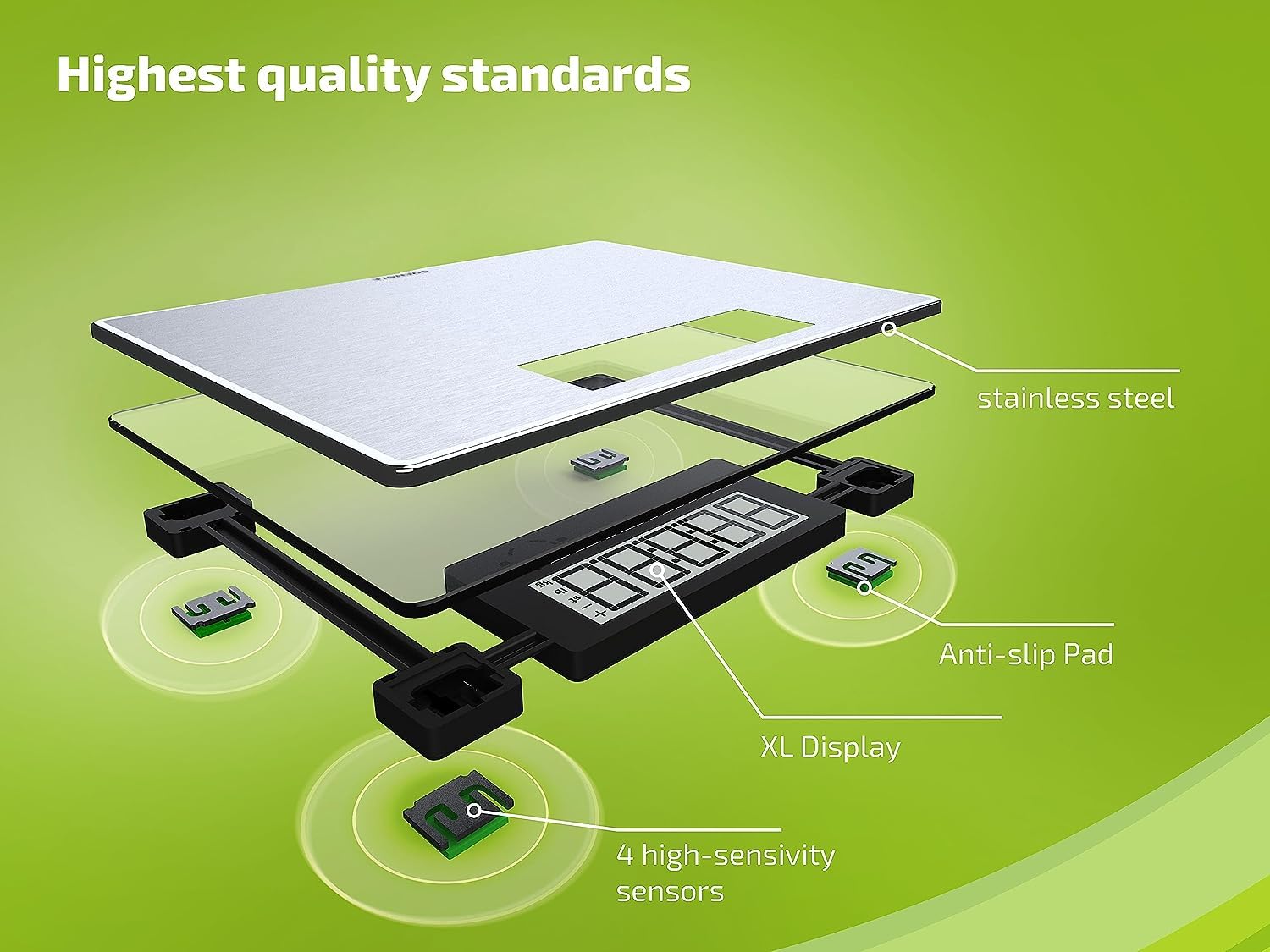 - First-class design - The digital scale impresses with its high-quality stainless steel surface, whose anti-fingerprint coating makes cleaning easier