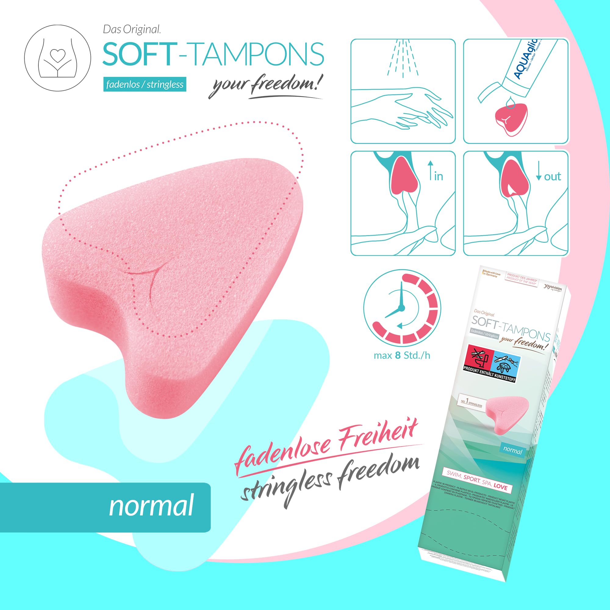 Ingredients: Medical-grade polyurethane sponge without chemicals (with Oeko-Tex Standard 100 certification); Insertion: Wash your hands. Remove the product from the packaging. Moisten: Moistening the tampon with a little lubricant or clean water can make it easier to insert. However, squeeze out some of the water before inserting to maintain absorbency. Assume the optimal position for insertion: for example, while squatting or on the toilet. Touch the side of the tampon with two fingers and squeeze. Insert your finger into the hollow at the bottom and place it on the tampon. As a conventional tampon, the menstrual sponge fits perfectly when it nestles against the cervix. Removal: Wash your hands. Assume the optimal position for removal: ideally with your legs wide apart while squatting. Press gently to push the tampon out. It is best to do this when it is full. Grab the flap with one finger and pull the tampon out. Wear time: Change the soft tampon regularly. Adjust the wearing time of the soft tampon according to the changing heaviness of your period. The maximum wearing time should be 8 hours. However, the manufacturer recommends changing after 4 to 6 hours. If you have heavy bleeding, you should change the soft tampons approximately every 3 to 5 hours. You reduce the risk of infection by changing the soft tampon immediately after visiting a swimming pool or having sex without a condom.