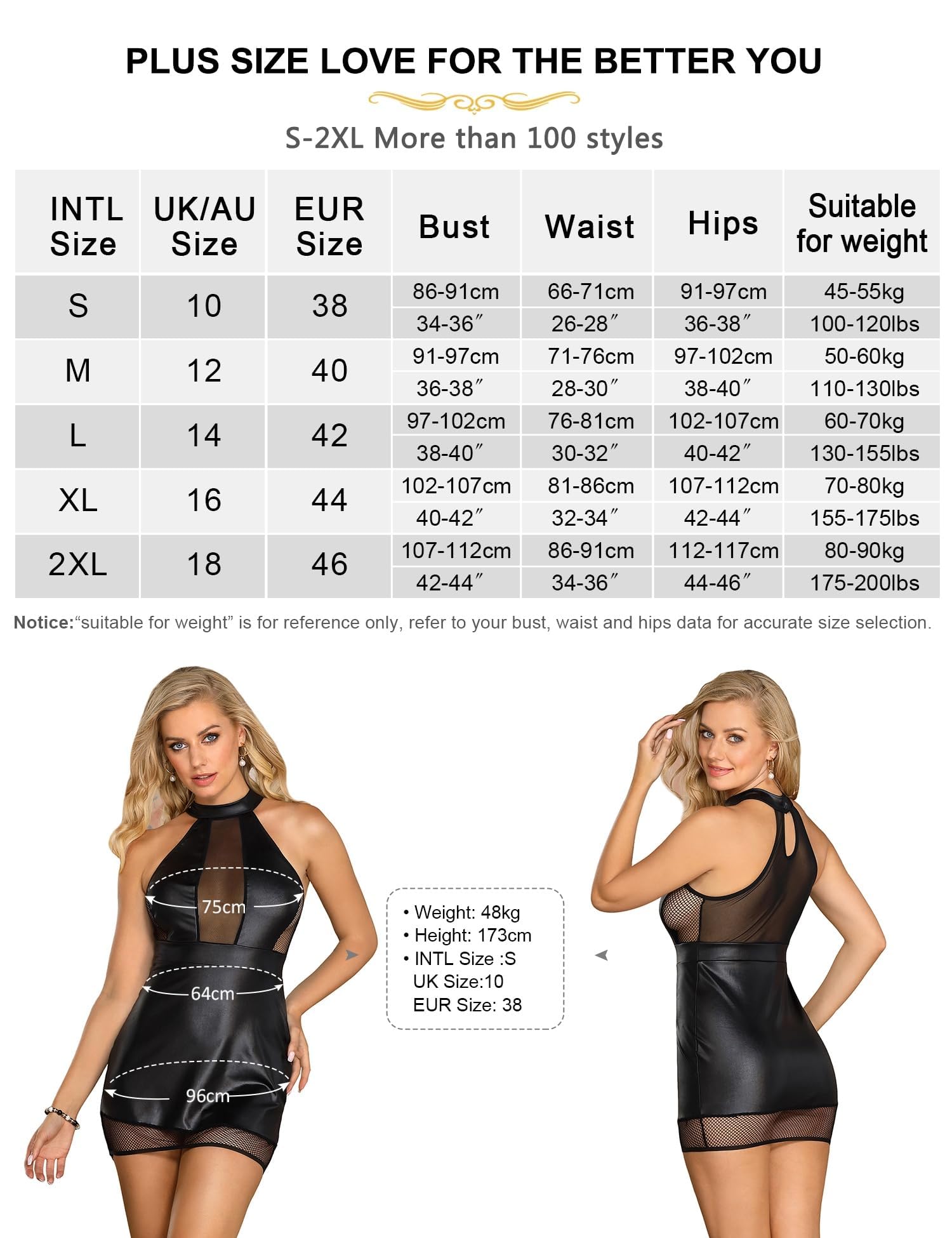 sunshinelady women's leather dress wetlook PU leather for plus size women mesh sleeveless lingerie bodycon clubwear sexy dress ladies halter neck babydoll mini dress curvy party dress elegant Valentine's Day 2XL black