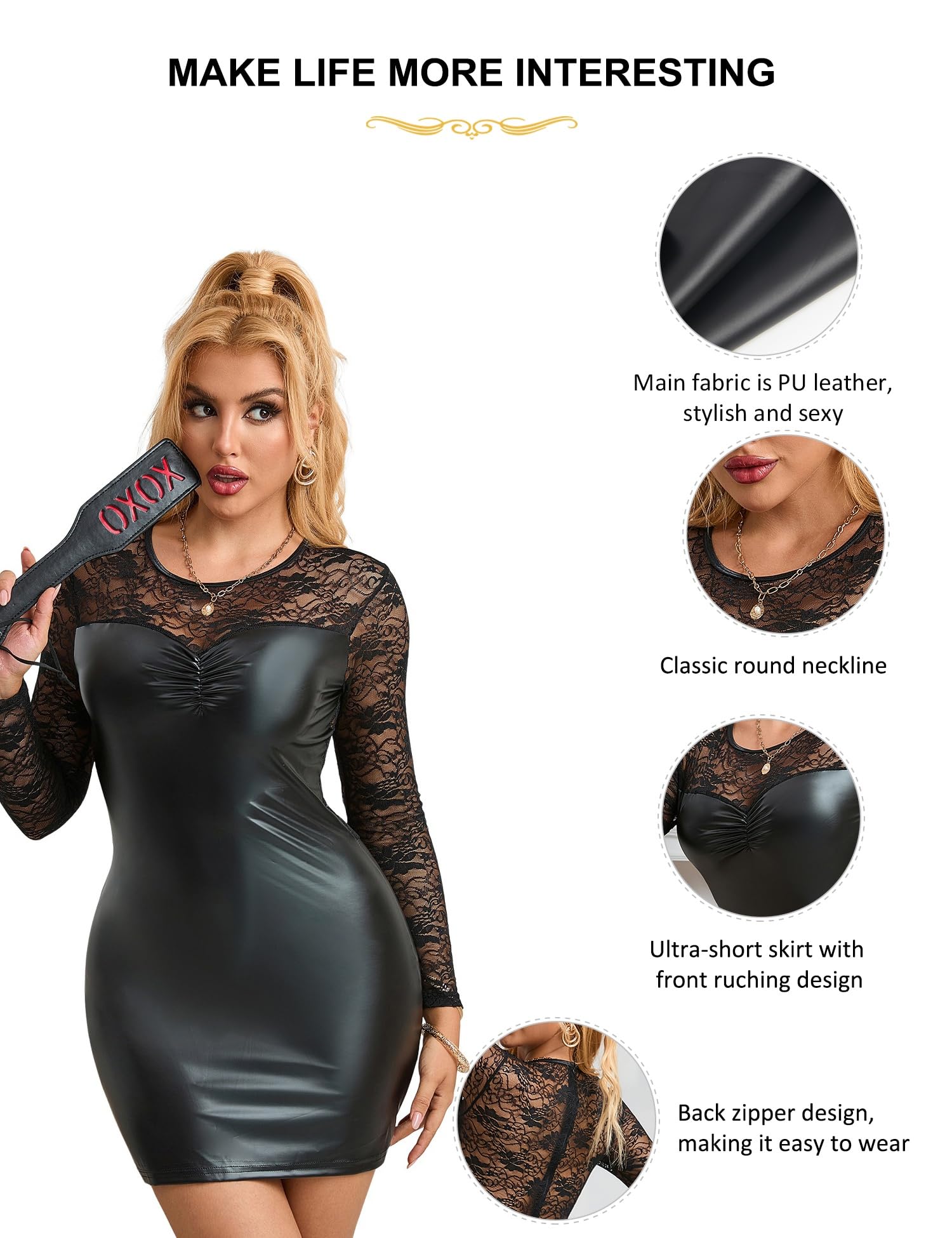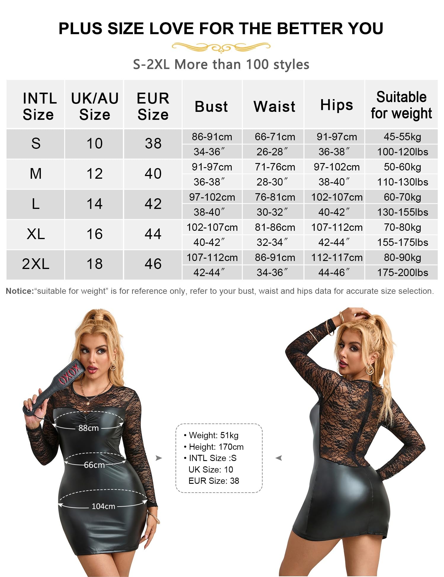 - This sexy leather dress for women is stretchy and accentuates the beauty of different body types. If you have a full figure, we recommend choosing the size based on the largest measurement of your bust, waist, or hips.