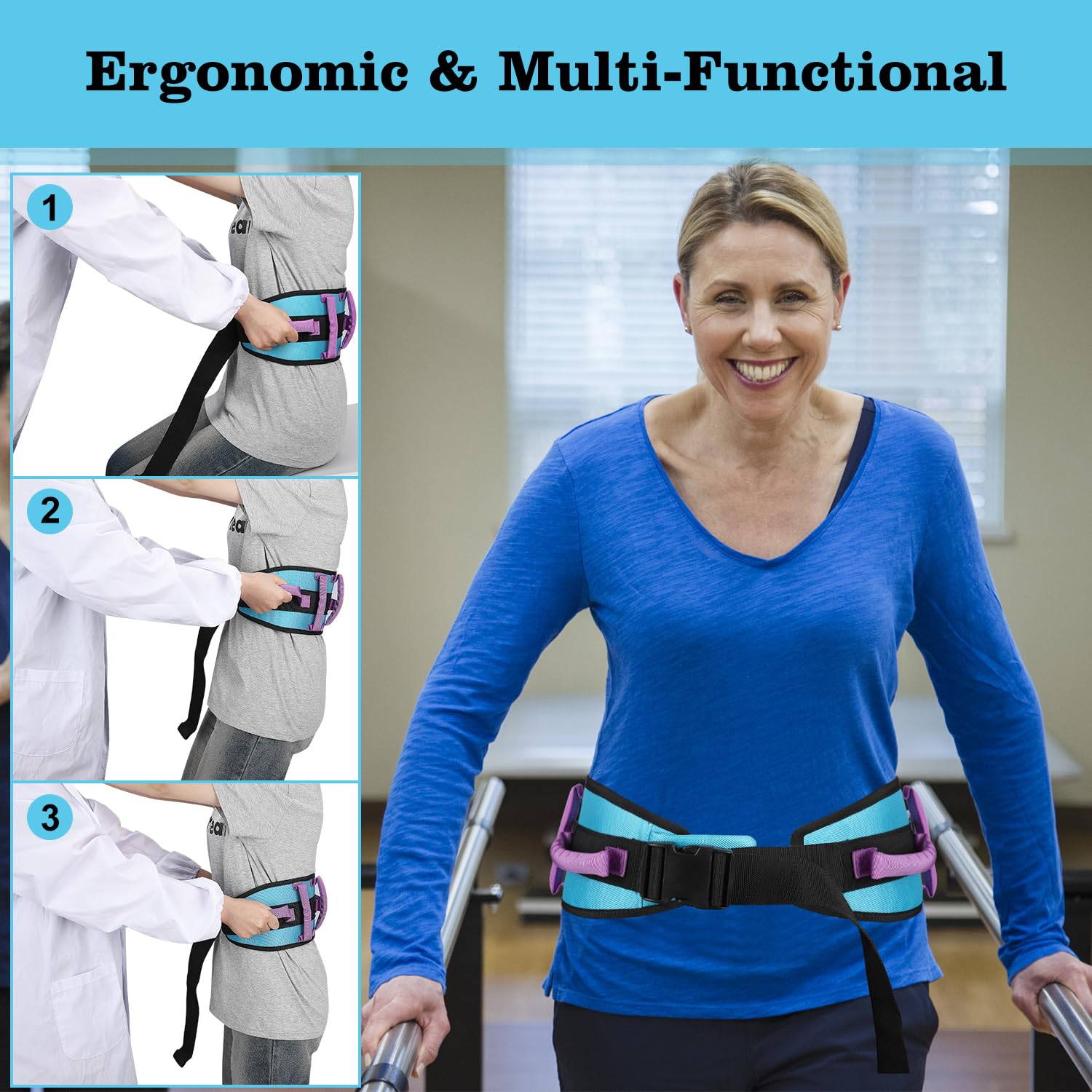 - Robust construction for easy care: Made of durable 1680D polyester fibers and sandwich mesh fabric, the walking belt offers exceptional strength and breathability; reinforced handles ensure durability, effortless cleaning, and quick drying, ideal for frequent medical use