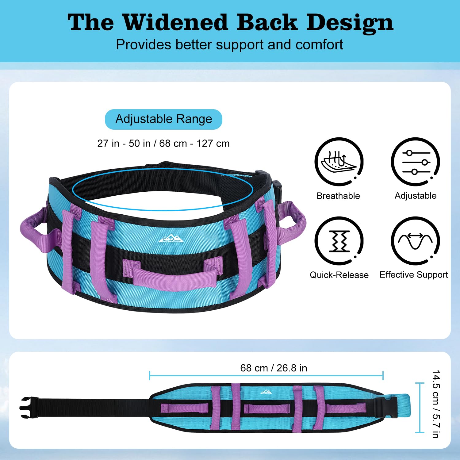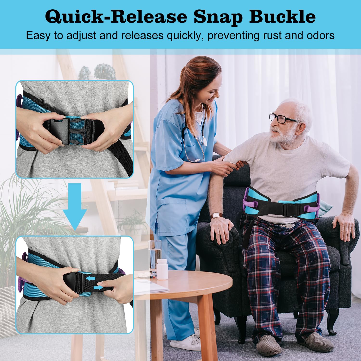 - Quick-release buckle: The plastic safety buckle is easy to adjust and release and prevents rust and odors; The padded bottom minimizes pressure and friction and increases comfort during use, especially during complex movements such as climbing stairs; The widened strap distributes weight evenly and provides more coverage and support during transfers, reducing the risk of injury to sensitive areas such as the shoulders