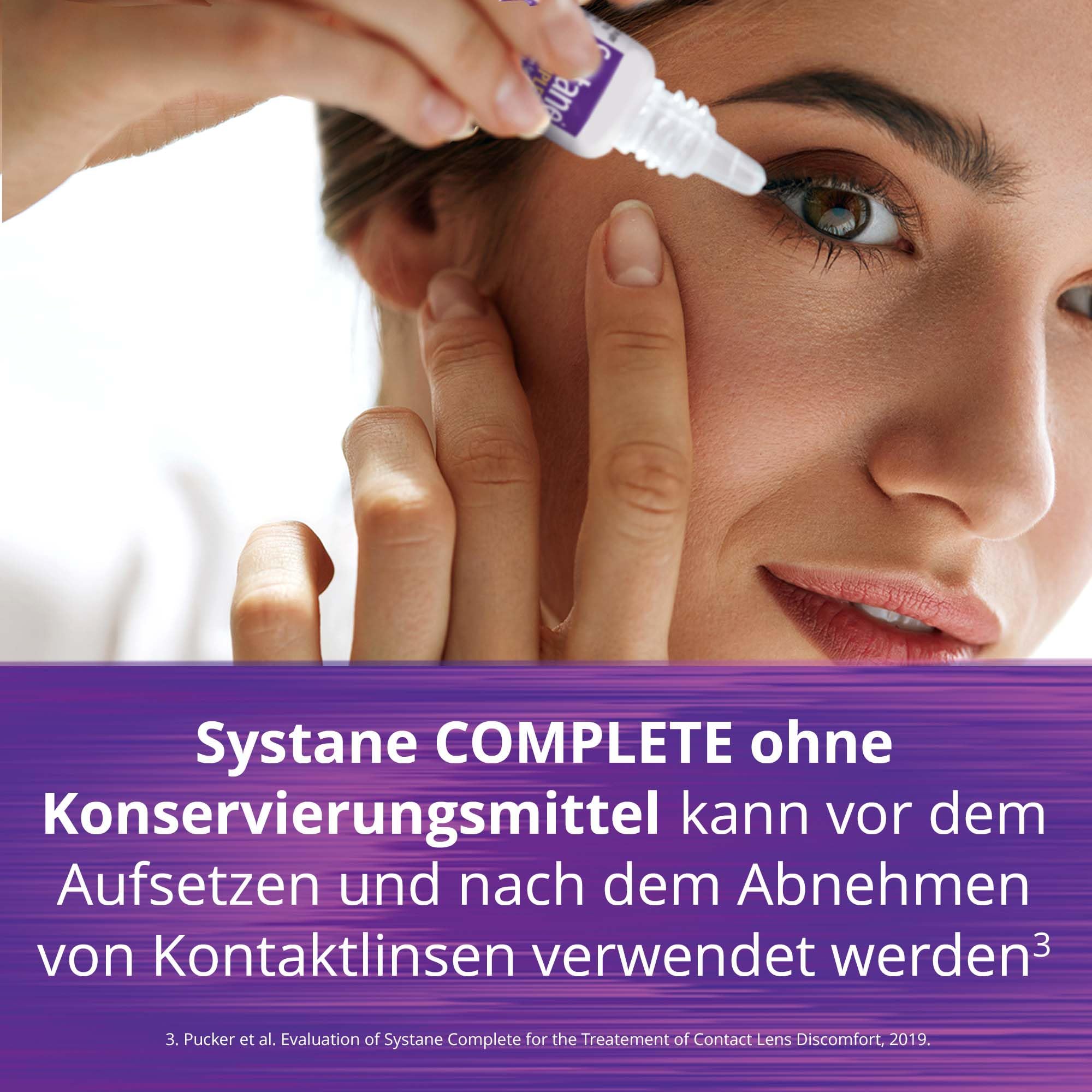 Systane COMPLETE preservative-free lubricating drops with nano-lipid technology are all-in-one drops for all types of dry eyes. They soothe, moisturize, and restore the tear film[3]. Systane COMPLETE preservative-free can be used before and after removing contact lenses[5].