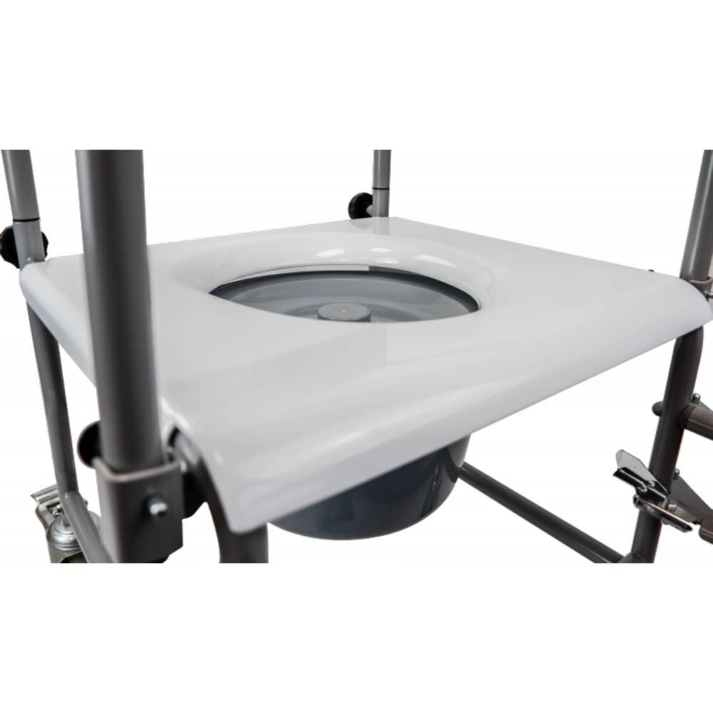 - Includes a bucket and potty holder. Sturdy, robust tubular steel frame. Lowerable armrests and swing-away, removable footrests facilitate transfer. Parking brakes on the rear casters ensure secure stability.