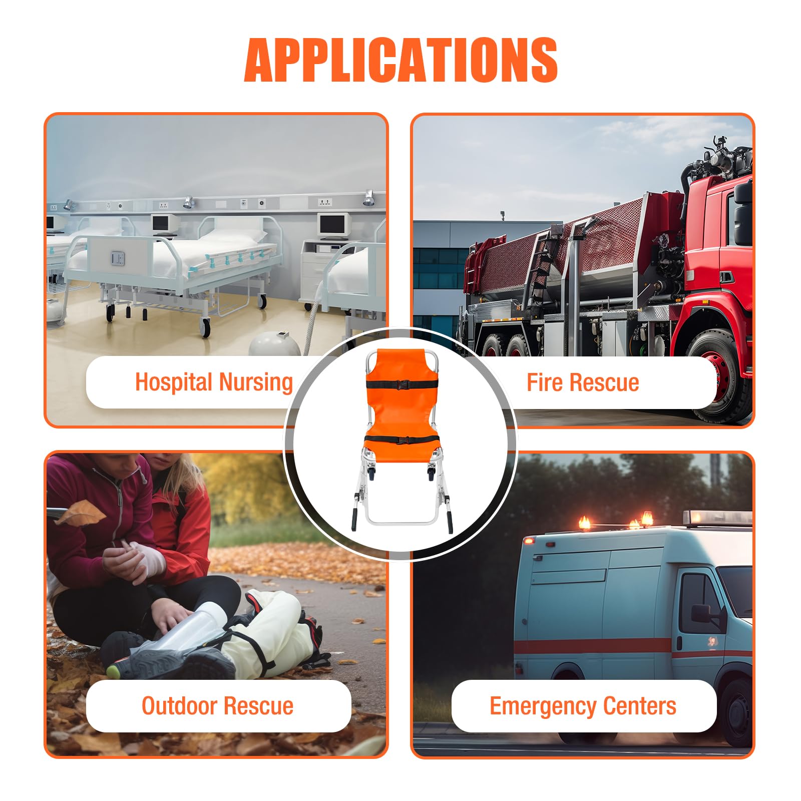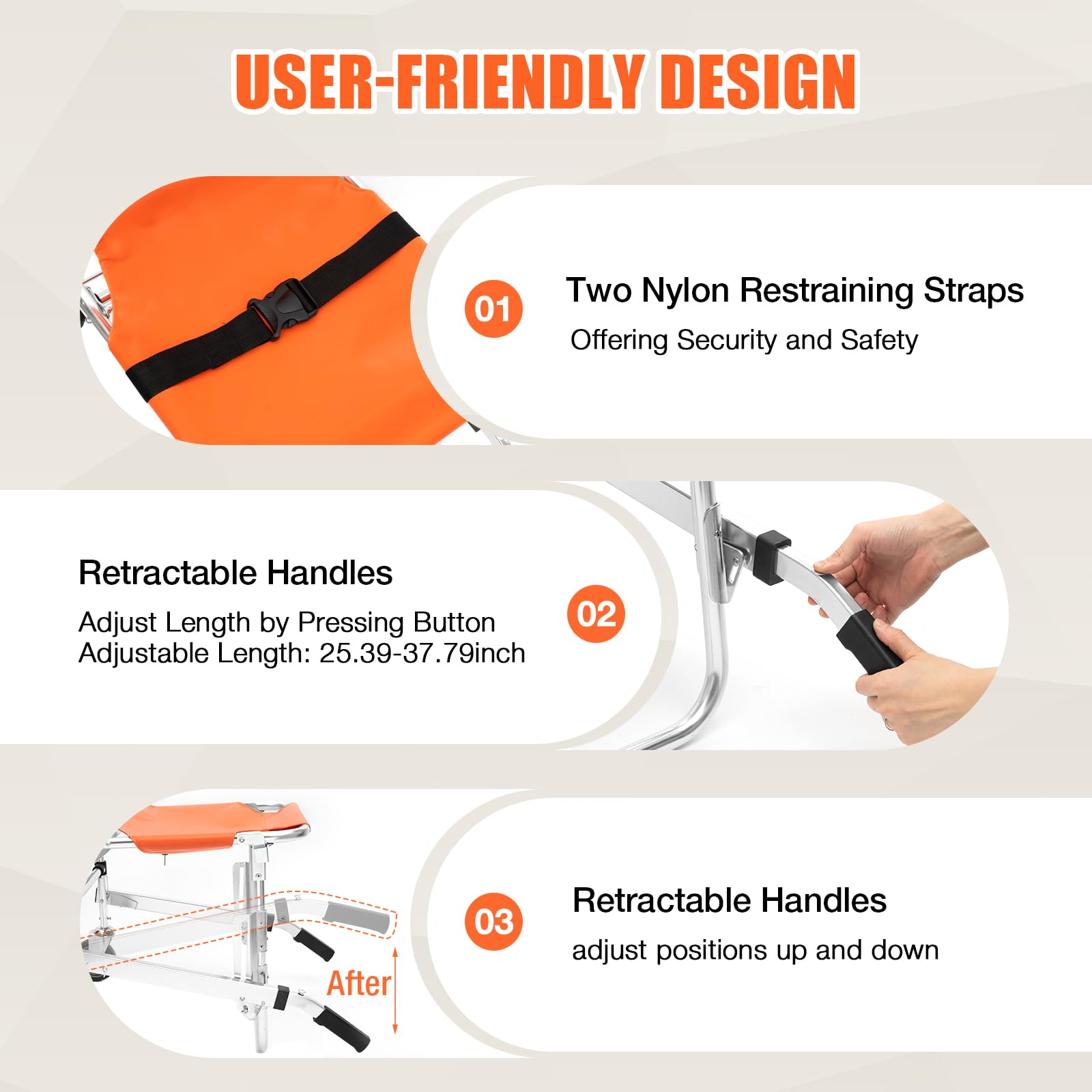 - User-friendly design: It features two adjustable nylon straps with plastic buckles to secure patients during transport and ensure their safety. The retractable handles on the front of the stair chair are also adjustable in length and position with a knob, allowing for easy lifting and ensuring individual safety.