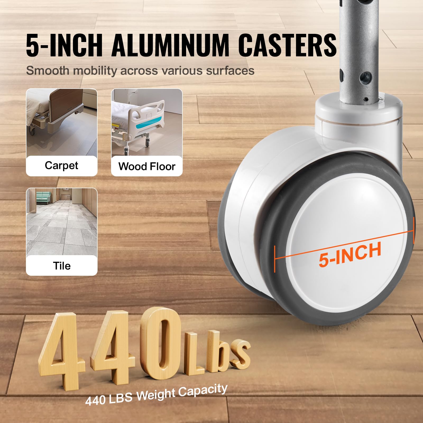 - 5-inch aluminum casters: Equipped with 5-inch locking casters, our electric medical ICU bed ensures smooth mobility on a variety of surfaces, including carpet, hardwood floors, and tile. With a weight capacity of 440 lbs, our premium hospital bed offers excellent stability and reliability, ensuring safety and ease of use for patients and caregivers.