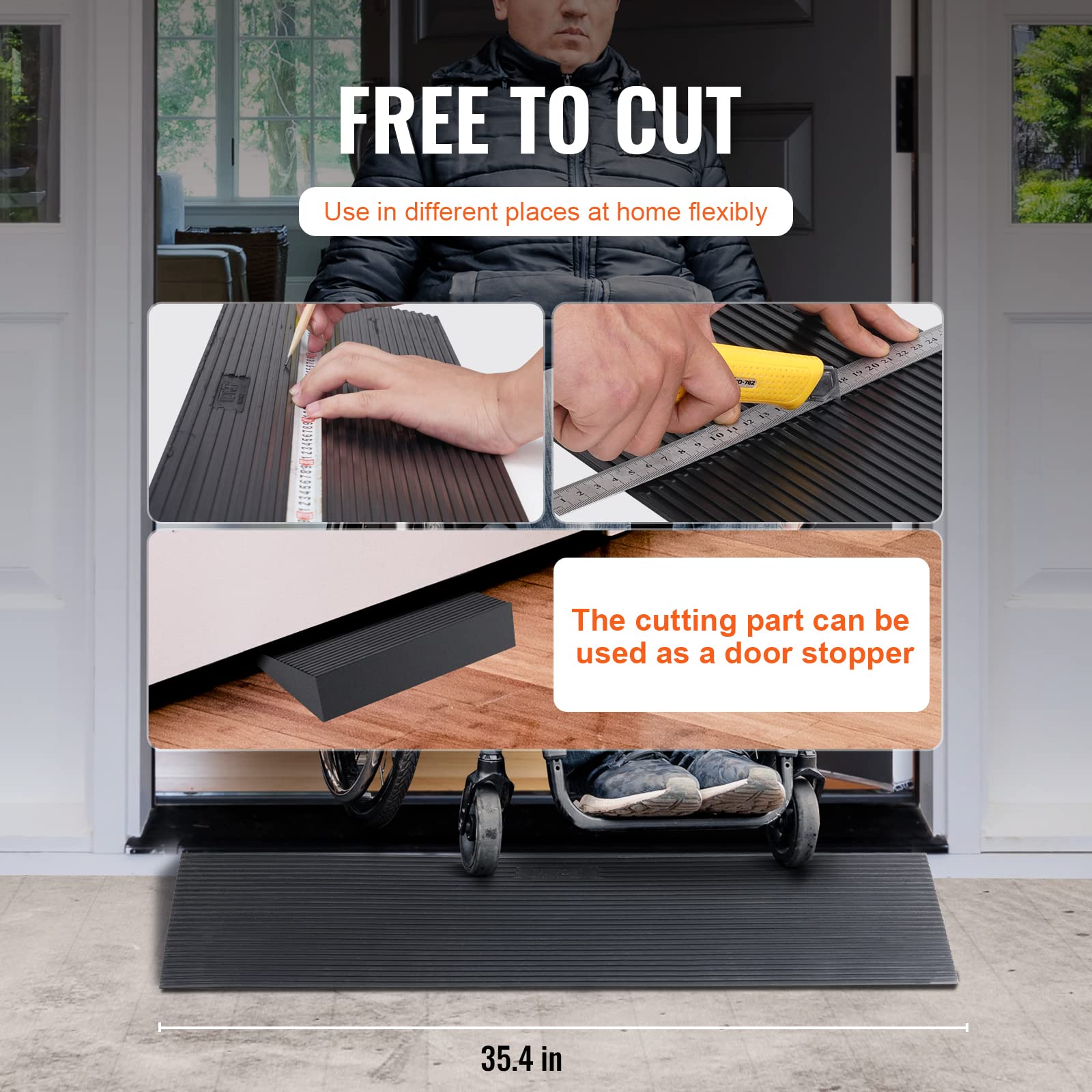 - Adjustable cutting: The flexible rubber material can be easily cut to fit different doorstep widths in different locations. The remaining pieces can also serve as doorstops, protecting your thresholds from damage. The slight incline allows robot vacuums to climb the ramp with ease.