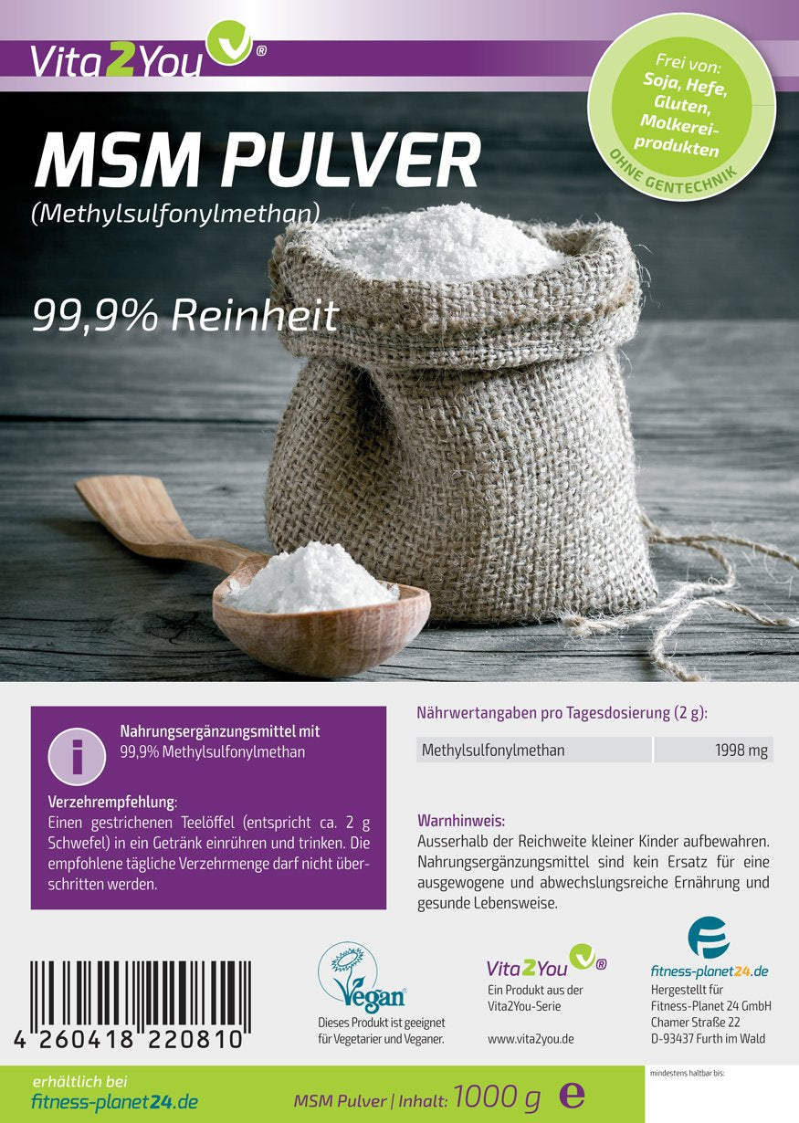 Brand: Vita2You Characteristics: ► VITA2YOU: Vita2You's MSM delivers a high 1998 mg of methylsulfonylmethane in just 2 g of MSM... Read more