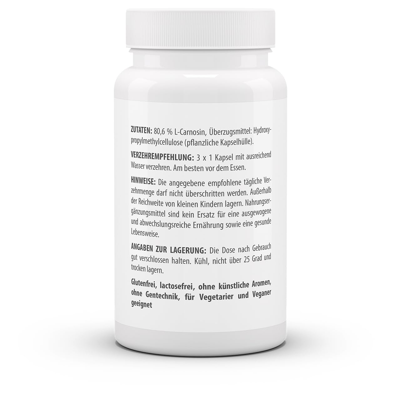 L-Carnosine, coating agent: hydroxypropylmethylcellulose (vegetable capsule shell).