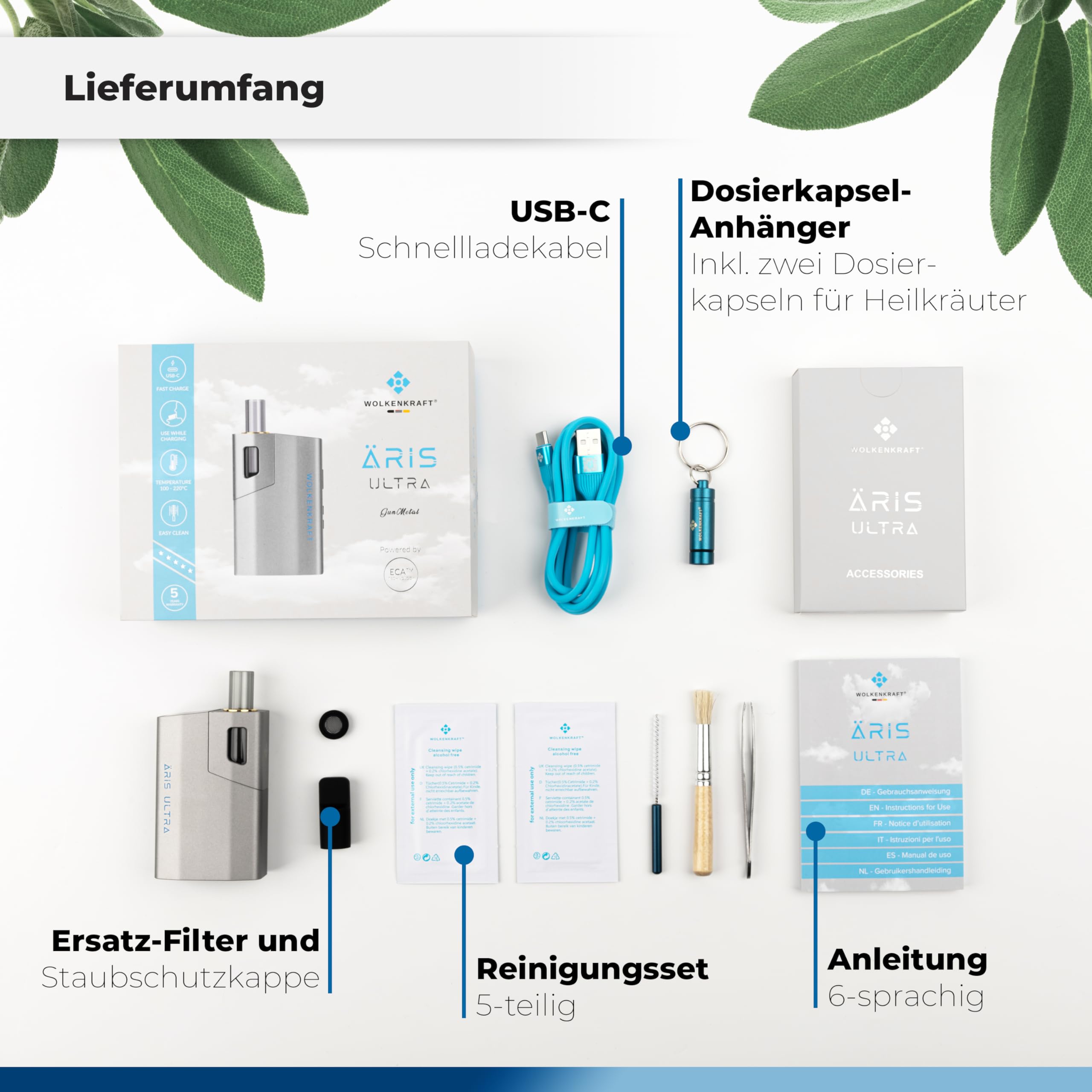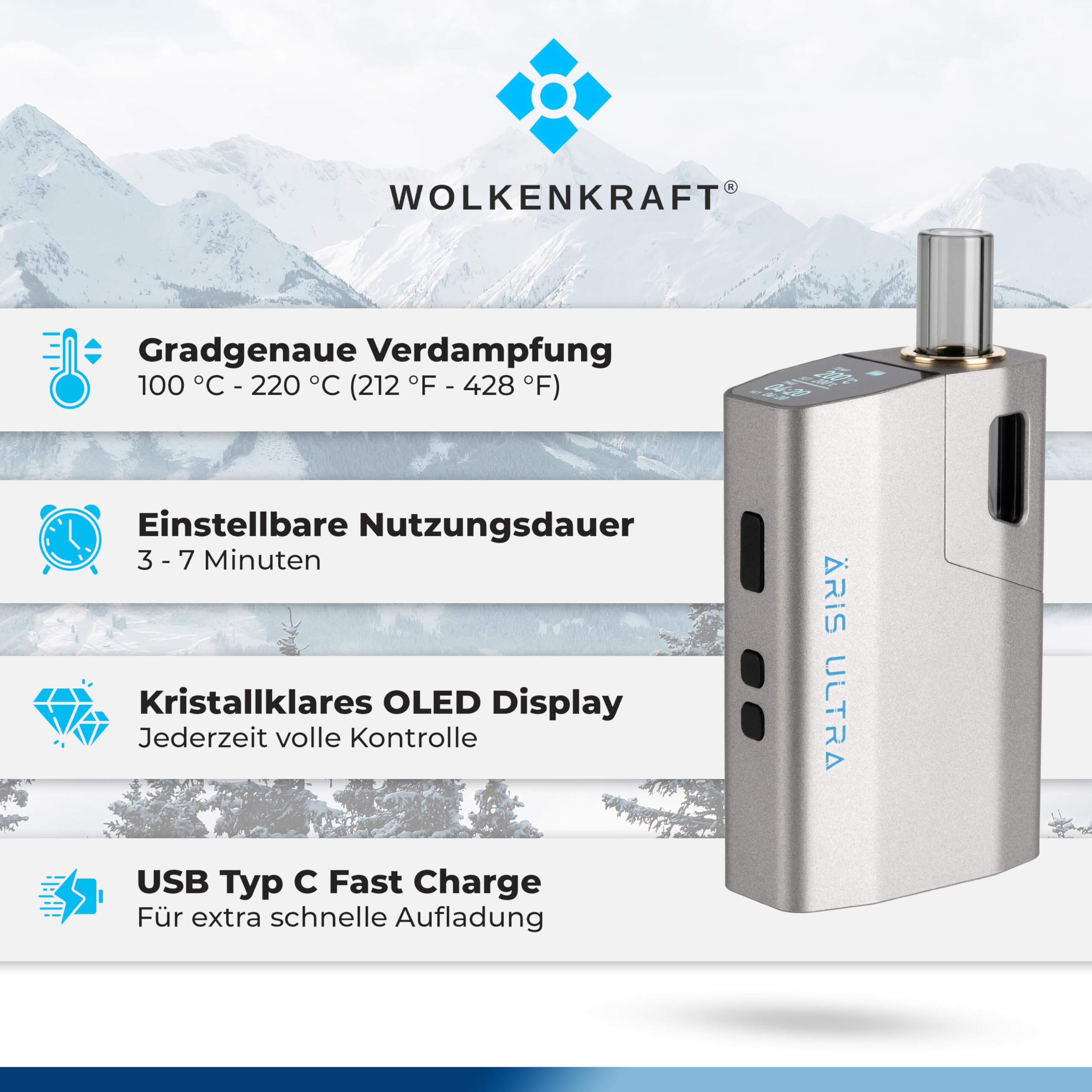 - [Precise vaporization between 100°C - 220°C] The temperature control has been further optimized and the temperature range expanded. The ÄRiS ULTRA now allows temperatures from 100°C - 220°C, thus offering a broader and more flexible range for almost all medicinal herb species.