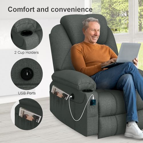 Details: YONISEE TV chair electrically adjustable, stand-up aid massage chair with massage heat function senior chair, relaxation lounger with footrest, 2 side pockets and cup holder, USB ports